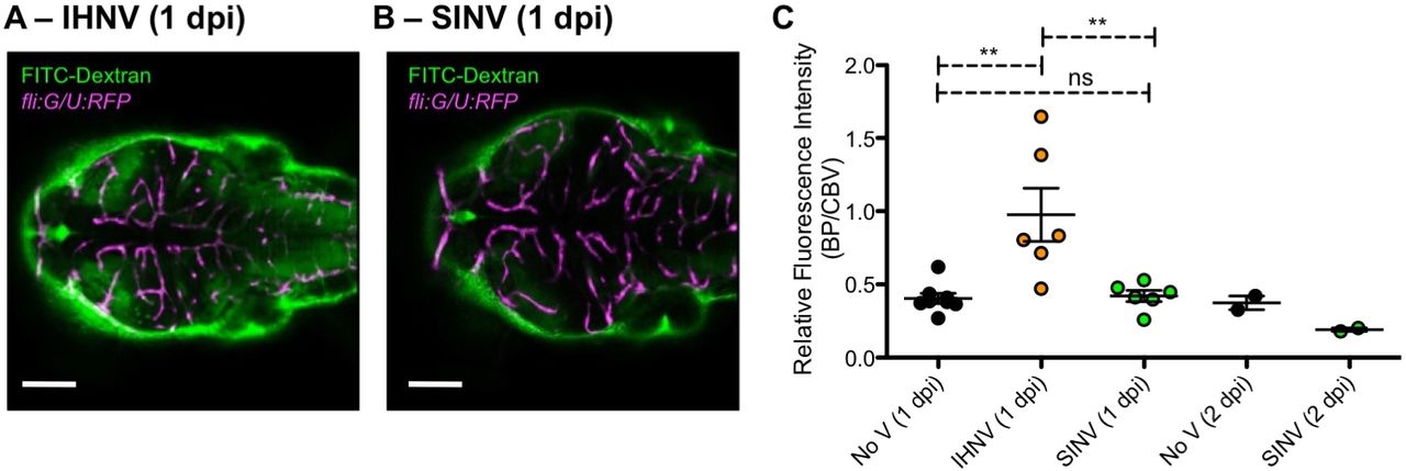 SINV does not induce BBB leakage. In vivo assay for BBB permeability. Uninfected controls, IHNV- and SINV-infected fliG/U:RFP larvae were injected IV at 1 and 2 dpi with 10 kDa FITC-dextran. One hour later, live confocal imaging of the brain was performed, to compare FITC intensity within the CBV and BP. (Injections at 2 dpi were performed only on uninfected controls and SINV-infected larvae, because of early death of IHNV-infected larvae.) (A,B) Representative images of IHNV-infected (A) and SINV-infected (B) larvae; single confocal plane at same depth. Scale bars: 100 μm. (C) Ratios of FITC fluorescence intensities measured in BP and CBV. n=2-5 larvae per group; two separate focal planes per larva.
