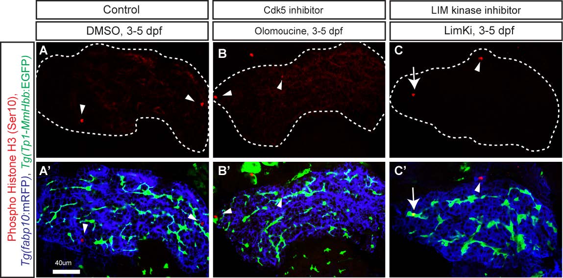 Cell proliferation measurement in olomoucine- and LIM kinase inhibitor- treated larvae. (A-C) Z-plane confocal images of the liver at 5dpf of DMSO- (A), olomoucine- (B) and LimKi-treated (C) larvae visualized for phospho-Histone H3 (pseudocolored red) expression. White dotted lines outline the liver. Phospho-Histone H3 expression was merged with Tg(Tp1-MmHbb:EGFP)um14 (Green) and Tg(fabp10:mRFP)lri2 (pseudo-colored blue) expression and shown separately in A'-C'. Arrowheads point to Phospho-Histone H3 expression in Tg(fabp10:mRFP)lri2 positive hepatocytes. Arrow points to Phospho-Histone H3 expression in Tg(Tp1-MmHbb:EGFP)um14 positive biliary epithelial cells. In the LimKi-treated liver, the number of Phospho-Histone H3 and Tg(Tp1- MmHbb:EGFP)um14 double positive cells (average 3.75 cells per liver, n=4, SD =0.9, p<0.05) increased compared to that of the DMSO-treated liver (average 1.3 cells per liver, n = 4, SD = 1.3), while in the olomoucine-treated liver, the number of double positive cells (average 1.0 cells per liver, n = 5, SD = 0.7) did not change. These data suggest that Tg(Tp1- MmHbb:EGFP)um14 positive biliary epithelial cells appeared to proliferate more in LimKitreated larvae.