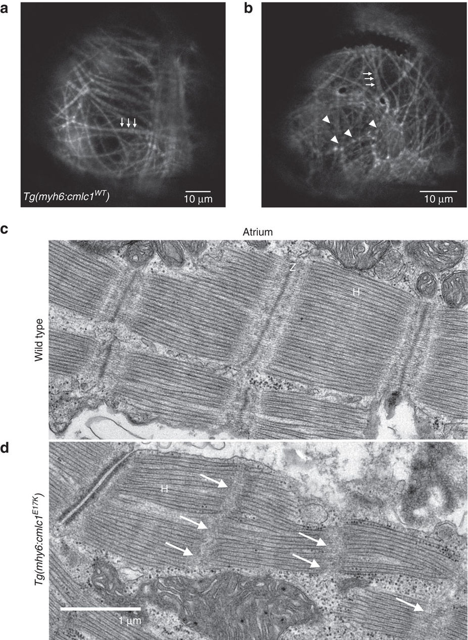 (a) A WT transgenic atrium at larval stage (5 d.p.f.) in the Tg(myl7:LifeAct-GFP)s974 background shows GFP-labelled F-actin, with myofibrils organized linearly across the atrium, either up-and-down or left-to-right. The myofibrils have a ‘dotted line’ pattern, with well-demarcated box-like shapes indicating normal arrangement of F-actin in the myofibrils. The non-fluorescent gaps (arrows) represent the actin-poor H-zones. (b) In an E17K transgenic larval atrium, some myofibrils appear unaffected (arrows), but there are large areas where myofibrils are not linearly organized and actin localization appears abnormal, giving a stippled appearance to the sarcomeres without clear H-zones (arrowheads). (c) Electron microscopy of adult WT zebrafish atrium shows clear H-zones and Z-disks. (d) Electron microscopy of E17K transgenic atrium shows preserved H-zones but absent Z-disks (arrows). H, H-zone. Z, Z-disk.