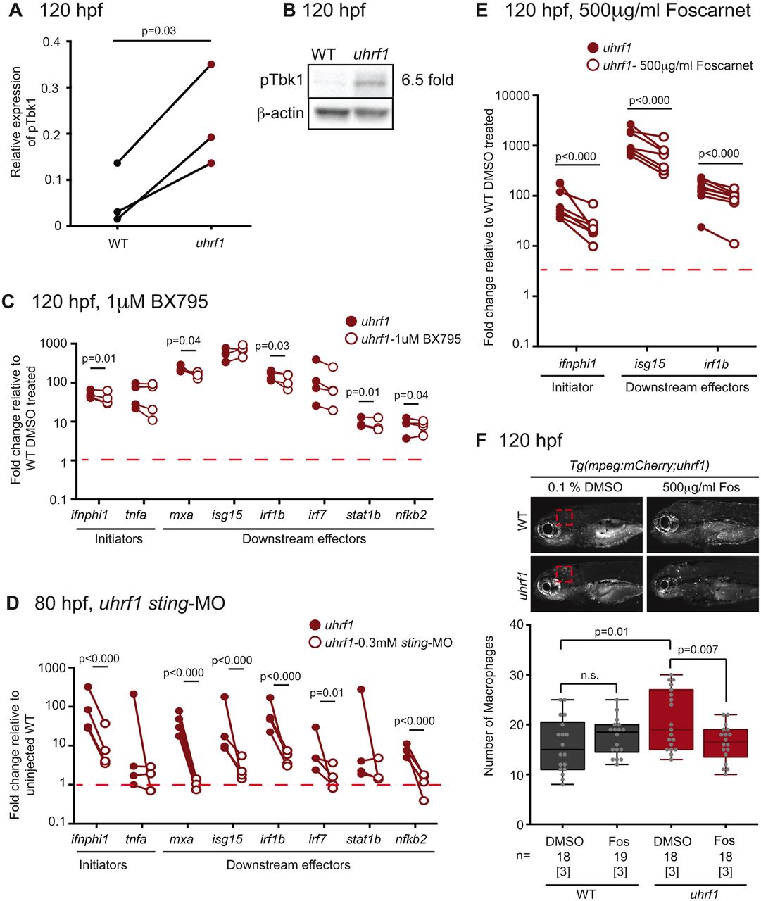 Cytosolic antiviral signaling is activated in uhrf1 mutants. (A) Change of pTbk1 protein levels quantified in three clutches of 120 hpf uhrf1 mutants and their siblings and (B) a representative western blot. (C) Embryos treated with 1 µM BX795 from 48-120 hpf were assayed for immune gene expression at 120 hpf by RT-qPCR in at least three clutches. Relative percentage change in gene expression is shown in treated uhrf1 compared with 0.1% DMSO-treated uhrf1 embryos (n=4). (D) Immune gene expression in uhrf1 mutant embryos injected with sting morpholino (MO) compared with uninjected uhrf1 mutants (n=4). (E) Examination of the expression of a limited panel of immune genes before and after 500 µg/µl Foscarnet (Fos) treatment in uhrf1 mutants (n=8). A line connecting two dots represents one paired sample of siblings from a single clutch. Significance was determined by t-test (A) or paired t-test (C-E). (F) Assessment of macrophage number in the head of embryos treated with 500 µg/µl Fos. The area quantified in WT and uhrf1 mutants is indicated (red dashed box). Error bars represent s.d.