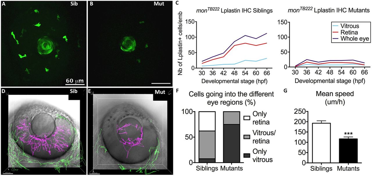 Moonshine macrophages display a defective recruitment towards the eye and into the retina. (A,B) In vivo observation of monNQ039Tg(Pu1:gfp) siblings (Sib) (A) and mutants (Mut) (B) at 30 hpf reveals that several GFP-positive myeloid cells have already arrived at the eye in the siblings, whereas there are few in the mutants; the lens shows apparent green fluorescence only due to its optical properties. (C) Counts (Nb, number) of L-plastin-positive leukocytes in the retina (red curve) and in the vitreous space (from where wt macrophages enter the retina; light blue curve) of monTB222/Tü siblings (left graph, 10–18 embryos/timepoint) and mutants (right graph, 10–16 embryos/timepoint) show an increasing number of macrophages in the eye (blue curve) and resulting colonization of the retina (red curve) in the sibling, whereas very few macrophages arrive at the eye in the mutants and their number does not increase with time. IHC, immunohistochemistry. (D–G) 4D tracking for 12 h of GFP-positive myeloid cells inside (pink tracks) and outside (green tracks) the eye in monNQ039Tg(Pu1:gfp) siblings (D) and mutants (E) from 48 hpf showing that the few mutant cells inside the eye mostly do not invade the retina (n=20 cells from two embryos), whereas it is the opposite in the siblings (n=66 cells from two embryos), as quantified in F. (G) Myeloid cells in the mesenchyme peripheral to the eye (green tracks) migrate more slowly in the mutants (n=42 cells from two embryos, mean speed 116.7 µm/h) than in the siblings (n=109 cells from two embryos, mean speed 192.9 µm/h). Error bars show the s.e.m. ***P<0.001.