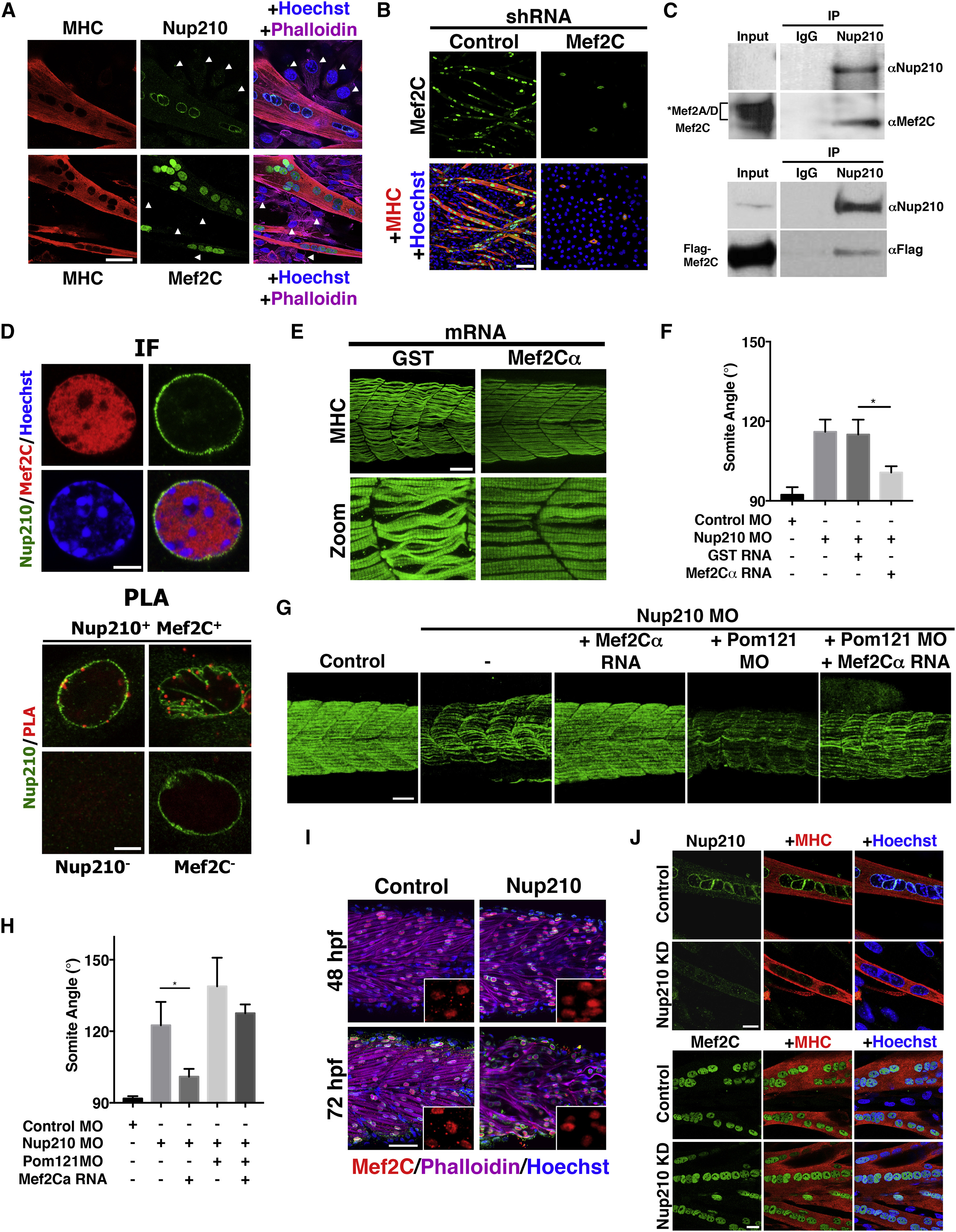 (J) The localization of Mef2C in control or Nup210-depleted myotubes was analyzed by immunofluorescence. Top panel shows the downregulation of Nup210 in shRNA-depleted myotubes. Scale bar, 20 μm.