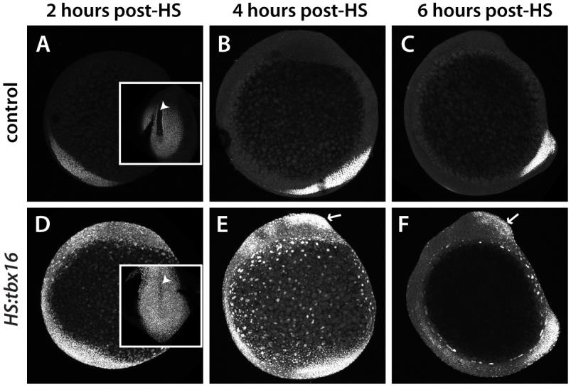 Ectopic Tbx16 is ubiquitous, labile and peaks at 4 hours post-heat shock. In control (A-C) and HS:tbx16 (D-F) embryos, immunofluorescence shows that Tbx16 protein levels have increased by 2 hours post-heat shock (A, D) with a peak at 4 hours post-heat shock (B, E), and that levels of Tbx16 have largely returned to normal by 6 hours post-heat shock (C, F). Inset in D shows ectopic Tbx16 in the notochord and neural tube (marked by arrowheads) when compared to the control inset in A (both dorsal views of the tailbud); arrows in E, F highlight the telencephalon, which retains ectopic Tbx16.