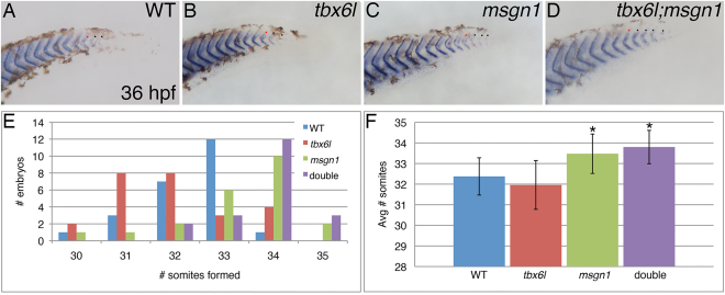 Loss of tbx6l does not enhance the msgn1 mutant phenotype. A–D: In situ hybridization for the cb1045/xirp2a somite boundary marker gene in 36-hpf wild-type (A), tbx6l mutant (B), msgn1 mutant (C), and tbx6l; msgn1 double-mutant (D) embryos that were raised together at standard temperature and fixed several hours after somitogenesis is normally completed. Lateral views of posterior tail are shown. E: Graph showing distribution of somite number per embryo for each genotype. F: Graph showing average somite number per embryo for each genotype. * P < 0.0005, when compared to wild-type.