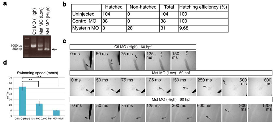 (a) Examination of the knockdown efficiency in morphants. Treatment with a low (1.7 ng) or high (5.1 ng) dose MO targeting mysterin-α (Mst) confirmed dose-dependent suppression of mysterin gene splicing at 2 dpf, as determined by RT-PCR. The lower band represents the products of impaired splicing (arrow). (b) Hatching defects in mysterin morphants. Morphants injected with a high dose of MO exhibit a significant hatching failure at 3 dpf. (c) Escape response to tactile stimulation at 60 hpf. Injection of a MO targeting mysterin reduces the movement of larvae in a dose-dependent manner. (d) Quantification of the swimming speed (mm/s) measured in 6 control morphants, 7 low-dose morphants, and 5 high-dose morphants at 60 hpf. **P < 0.01; ***P < 0.001.