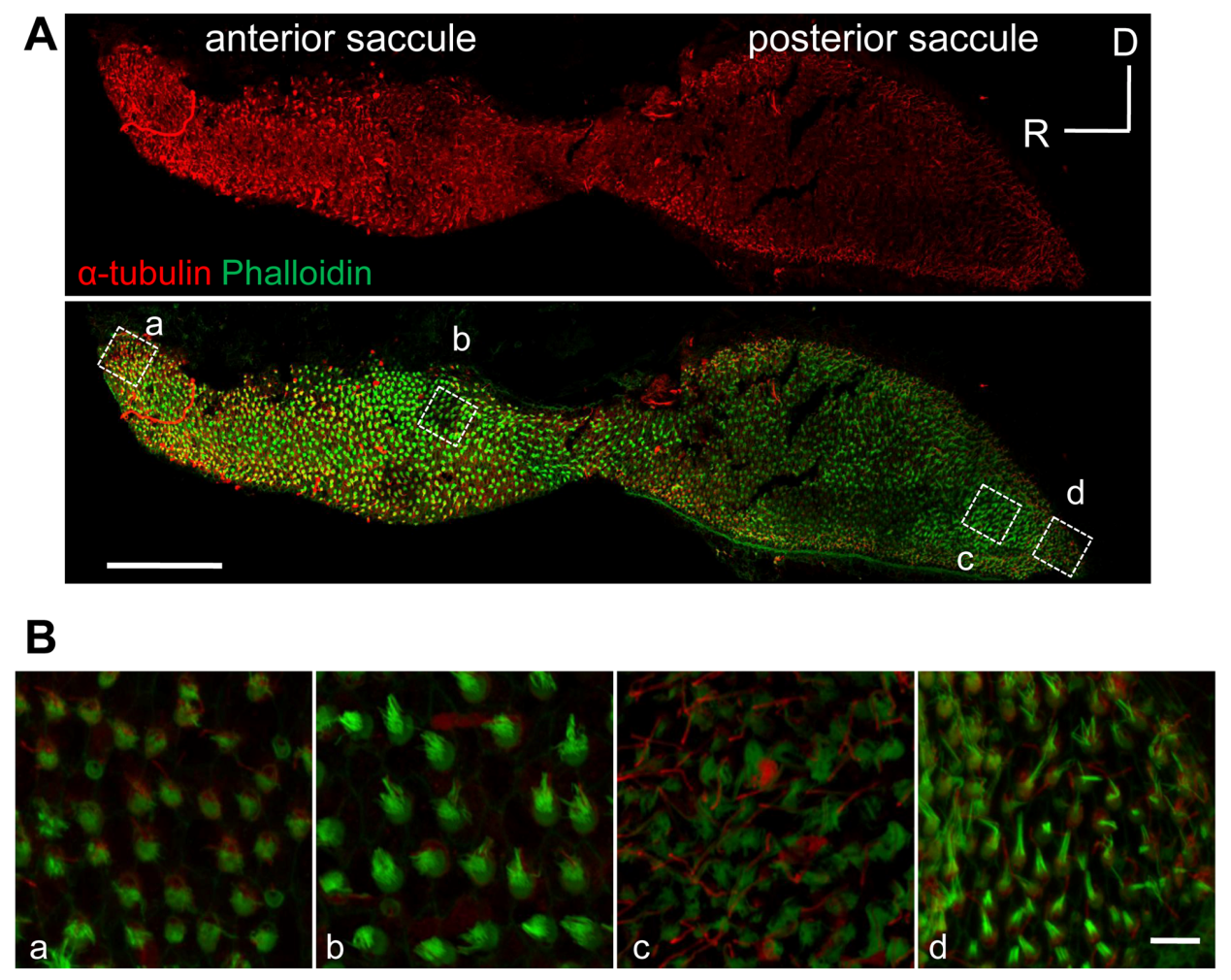 Images of saccular HC bundles. (A) Representative images of kinocilia, which were immunostained for α-tubulin (red), and stereocilia, which were counterstained with phalloidin (green). Scale bars: 100 μm. Fish TL = 41 mm. (B) Magnified images from regions inside the dotted rectangles in the lower panel of (A). Scale bars: 5 μm (a-d).