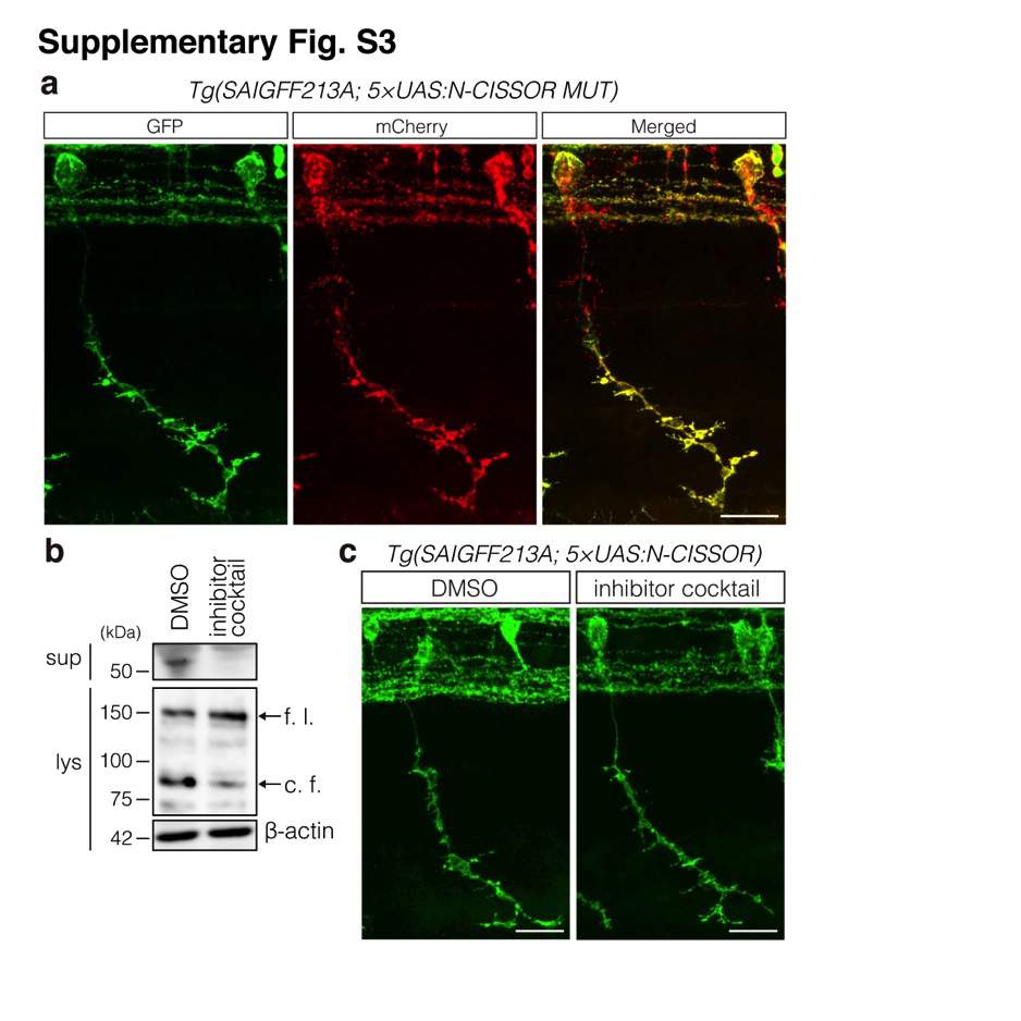 Inhibition of N-‐CISSOR cleavage in zebrafish embryos. (a) Representative image of Tg (SAIGFF213A; 5×UAS-‐N-‐CISSOR MUT) at 36 hpf. Scale bar: 10 μm. (b) Western blot analysis of the inhibition of N-‐CISSOR cleavage following treatment with an inhibitor cocktail (0.5 μM GM6001 and 0.1 μm BACE inhibitor IV; dissolved in DMSO) for 4 h. f. l.: full-‐length; c. f.: cleaved fragment. (c) GFP image of CaP neurons in Tg (SAIGFF213A; 5×UAS-‐N-‐CISSOR) treated with an inhibitor cocktail (0.5 mM GM6001 and 0.1 mM BACE inhibitor IV; dissolved in DMSO) obtained between 25 and 36 hpf. Scale bar: 20 μm