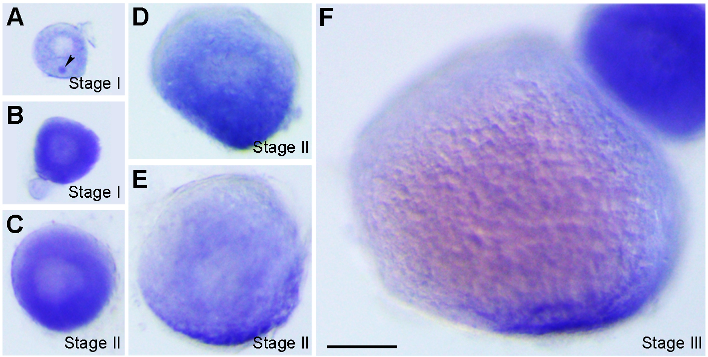 Localisation of vrtn transcripts during oogenesis. (A) Stage I oocyte (80 μm in diameter), with vrtn transcripts detected in the ooplasm, and in the Balbiani body (arrowhead). (B) Stage I oocyte (100 μm in diameter), with strong uniform localisation in the ooplasm. (C) Stage II oocyte (150 μm in diameter) shows a slight vegetal enrichment. (D) Stage II oocyte (200 μm in diameter), with evident vegetal localisation. (E) Stage II oocyte (230 μm in diameter) shows vrtn localisation mainly in the vegetal region. (F) Stage III oocyte with vrtn transcripts restricted exclusively in the vegetal pole cortex. Oocytes were staged according to their diameters: stage I, 70-140 μm; stage II, 140-340 μm; stage III, 340-690 μm. Scale bar: 100 μm.