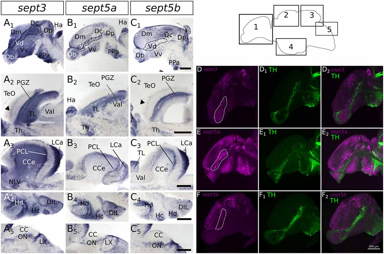 Expression of sept3, sept5a and sept5b in substructures of the adult zebrafish brain. The expression pattern of sept3 (A1–A5), sept5a (B1–B5), and sept5b (C1–C5) is shown in sagittal sections of adult brains. The regions of the brain are indicated in the scheme (1–5). In the telencephalon (1) sept3, sept5a and sept5b are expressed in dorsal telencephalic areas (Dm, Dc and Dp) and ventral telencephalic areas (Vd and Vv). Septins are expressed in a stream in the Vd region (outlined by dotted line). Additionally, sept3, sept5a and sept5b is expressed in the Ob. The sept3 and sept5b positive layer in the TeO is labeld with black arrowheads (A2,C2). In the cerebellum (3,5) sept3, sept5a and sept5b is expressed in the LCa, and in the region of the purkinje cell layer (PCL). Sept3 is additionally expressed in the CCe. Furthermore, hypothalamic sagittal section are shown (4). Abbreviations can be found in Table 1. To identify dopaminergic cells, ISH stained brains (magenta) against sept3 (D), sept5a (E), and sept5b (F) were counterstained with an antibody against tyrosine hydroxylase (TH, green in D1,E1,F1) and analyzed with a confocal microscope and merged (D2,E2,F2). Pictures in (D–F) are maximum projections of confocal slices through adult sagittal brain sections. Scale bars 200 μm.