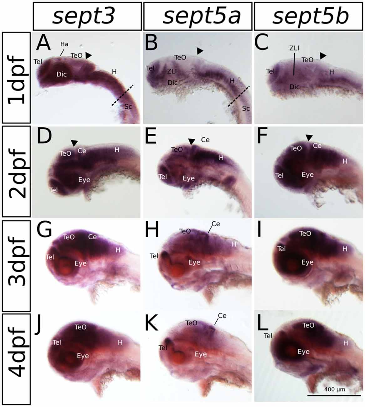 The expression pattern of sept3, sept5a and sept5b in 1–4 dpf zebrafish larvae in a lateral view. Sept3, sept5a and sept5b expression is shown by ISH, the blue color indicates the cells expressing the mRNA of each septin. The expression of sept3 is shown in 1 dpf (A), 2 dpf (D), 3 dpf (G) and 4 dpf (J) zebrafish larvae. Sept5a expression is shown in 1 dpf (B), 2 dpf (E), 3 dpf (H) and 4 dpf (K) larvae. Zebrafish larvae 1–4 dpf stained with the sept5b probe are shown in (C,F,I,L). The telencephalon (Tel), habenula (Ha), diencephalon (Dic), the zona limitans intrathalamica (ZLI), cerebellum (Ce), tectum (TeO), eye, the spinal cord (Sc) as well as the hindbrain (H) are labeled. The border between hindbrain and spinal cord is marked by a dashed line. The midbrain-hindbrain boundary (MHB) is labeled (black arrowhead).