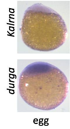 In situ hybridization of kalrna and durga in the zebrafish egg. In situ hybridization shows kalrna and durga transcript expression in zebrafish egg.