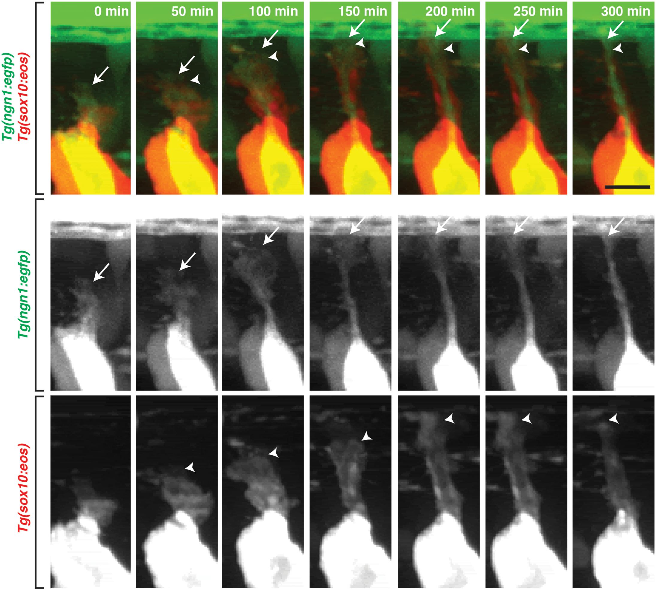 Images from a 24 hour time-lapse movie starting at 48 hpf in a Tg(sox10:eos);Tg(ngn1:egfp) embryo that was exposed to UV light to photoconvert Eos in the whole embryo. These frames show the pioneer axon (green) and associated glia (red) migrate together to the DREZ. Below are individual channels for GFP and Eos. Arrows denote the pioneer axon growth cone and arrowheads denote location of the DRG glia. Scale bar, 25 μm.