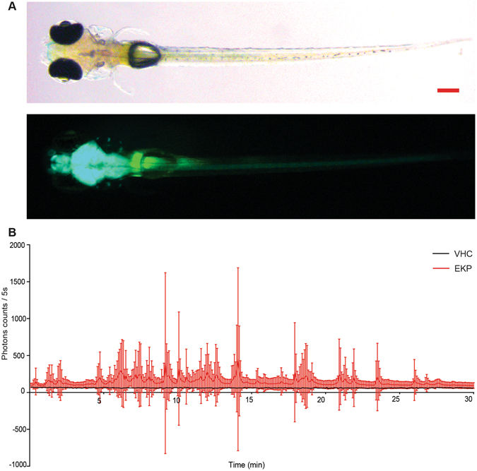 Neuroluminescence recording of Tg(elavl3:GA) zebrafish exposed to EKP. (A) Bright field (upper) and fluorescence (lower) micrographs of 7 dpf Tg(elavl3:GA) larva (scale bar: 0.20 mm) (B) Photon emission of 7 dpf larvae exposed to VHC (black line) or EKP (400 µM) (red line), after a 20 h incubation to CLZN-h (40 µM) exposure during a 30-min recording period. The total photon emission (y-axis) is counted per 5-second (sec) interval (x-axis). Results are expressed as mean ± s.d. of 18 independent experiments. For each experiment a group of three larvae was used.