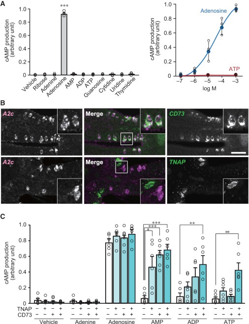 (A) Ligand specificity (left, n = 3) and sensitivity (right, n = 4) of A2c receptor examined by cAMP production assay in CHO-K1 cells. A2c is activated only by adenosine with high specificity and sensitivity. Unpaired t test (p = 0.00000016). ∗∗∗p < 0.001.