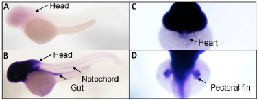 Fig. s1 Figure S1. Tissue-specific expression of gatad1 transcripts was revealed by in situ hybridization in 2 dpf zebrafish embryos. Short-time stain only revealed head expression of gatad1 (A), but long time stain show gatad1 expression in gut, notochord, heart and pectoral fin (B–D).