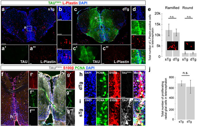 (a) Immunohistochemistry (IHC) for L-Plastin (red) and TAUP301L (green) on coronal sections of telencephalon of a 6 month-old sTg animal. Single channel images of the whole section for TAUP301L (a’) and L-Plastin (a”). (b) The enlarged view of the inset in a. (c) IHC for L-Plastin (red) and TAUP301L (green) on coronal sections of telencephalon of a 6-month old dTg animal. Single channel images of the whole section for TAUP301L (c’) and L-Plastin (c”). (d) The enlarged view of the inset in c. (e) Quantification of round and ramified L-Plastin-positive cells in the telencephalon in sTg and dTg animals. (f) Immunohistochemistry (IHC) for S100β (red), PCNA (green) and TAUP301L (white) on coronal sections of telencephalon of a 6-month old sTg animal. Single channel images of the whole section for S100β (F’), PCNA (f”), and TAUP301L (f”’). (g) IHC for S100β (red), PCNA (green) and TAUP301L (white) on coronal sections of telencephalon of a 6-month old dTg animal. Single channel images of the whole section for S100β (g’), PCNA (g”), and TAUP301L (g”’). (h) The enlarged view of the inset in f. (i) The enlarged view of the inset in g. (j) Quantification of the total number of proliferating glial cells in the telencephalon of sTg and dTg animals. Values represent mean ± s.e.m. *p < 0.05, **p < 0.01, ***p < 0.005. Scale bars equal 50 μm (a–g”’) and 20 μm (h,i). n = 7 fish and > 30 histological sections for every staining. All animals are 6 months old.