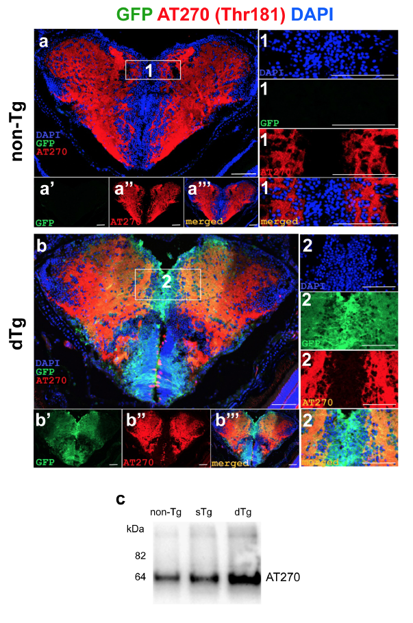 Fig. s8 (a) Immunohistochemistry (IHC) for AT270 (red) and GFP (green) on coronal sections of telencephalon of a 6-month old nontransgenic animal. (a’, a’’) Individual fluorescent channels for GFP (a’) and AT270 (a’’). Insets show the enlarged view of the frame in a with individual channels for DAPI, GFP and AT270, and merged image. (b) IHC for AT270 and GFP on coronal sections of telencephalon of a 6-month old dTg animal. (b’, b’’) Individual fluorescent channels for GFP (b’) and AT270 (b’’). Insets show the enlarged view of the frame in b with individual channels for DAPI, GFP and AT270, and merged image. (c) Western blot for AT270 from brains of non-Tg, sTg and dTg animals. Scale bars equal 50 μm. n = 6 fish for every staining.