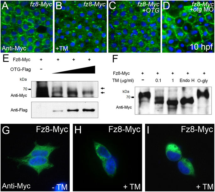 OTG regulates glycosylation of Fz8 receptor. (A–D) Immunostaining of Myc (green) in embryos (10 hpf) injected with fz8-myc mRNA alone (A), with OTG mRNA (C), with otg MO (D) or treated with an N-glycosylation inhibitor tunicamycin (B). For panels A–D and G–I, nuclei are counter-stained with Hoechst 33342 (blue). (E) HEK293 cells were transfected for Fz8-Myc and increasing amounts of OTG-Flag. Overexpressed Fz8-Myc (anti-Myc) and OTG-Flag (anti-Flag) proteins are analyzed by immunoblotting. (F) HEK293 cells were transfected for Fz8-Myc and then treated with tunicamycin, or their lysates were incubated with endoglycosidase H (Endo H) or O-glycosidase (O-Gly). Overexpressed Fz8-Myc protein (anti-Myc) is analyzed by immunoblotting. Full-length blots are presented in Supplementary Fig. S19. (G–I) HEK-293 cells were transfected with Fz8-Myc and then treated with vehicle DMSO alone (G) or with tunicamycin [0.1 μg/ml (H) and 1 μg/ml (I)]. Cells are immunostained for Myc (green).