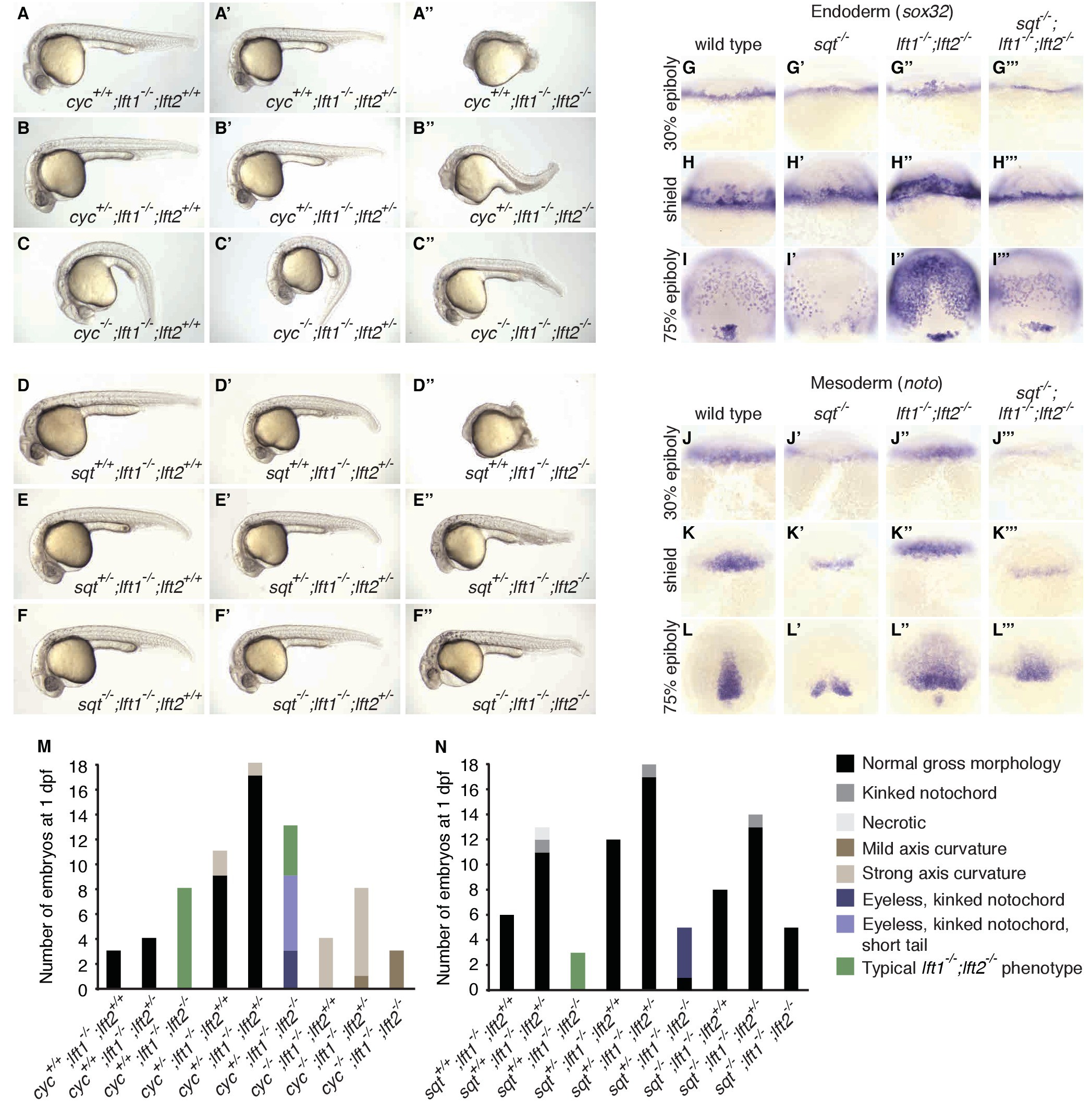 (A–F’’) Lateral views of embryos with indicated genotypes at 1 day post-fertilization (dpf). Embryos are progeny from an incross of cycm294/+;lft1-/-;lft2+/- (A–C’’) or sqtcz35/+;lft1-/-;lft2+/- (D–F’’) adults, and were genotyped after imaging (see Materials and methods for details). In contrast to lft1-/-;lft2-/- mutants (A’’, D’’), nodal+/-;lft1-/-;lft2-/- mutants (B’’, E’’) have long tails and well-defined heads, and some nodal-/-;lft1-/-;lft2-/- mutants (C’’,F’’) have eyes in addition to full-length tails. nodal-/-;lft1-/-;lft2-/- and nodal+/-;lft1-/-;lft2-/- mutants are not viable. cyc homozygotes exhibit the expected curved body axis (Sampath et al., 1998) (C,C’), but curvature is reduced in cyc-/-;lft1-/-;lft2-/- embryos (C’’). (G–L’’’) In situ hybridization assessing expression of endodermal (sox32/casanova) (G–I’’’) or mesodermal (noto/floating head) (J–L’’’) genes in the indicated genotypes (dorsal views). Mesendoderm upregulation is less pronounced in sqt-/-;lft1-/-;lft2-/- compared to lft1-/-;lft2-/- mutants. (M–N) 72 embryos from a cyc+/-;lft1-/-;lft2+/- incross (M) and 84 embryos from a sqt+/-;lft1-/-;lft2+/- incross (N) were scored and imaged at 1 dpf, and subsequently genotyped. Number of embryos of each genotype with the indicated phenotype at 1 dpf is shown. Together, these results demonstrate that loss of sqt or cyc can suppress lft1-/-;lft2-/- mutant phenotypes.