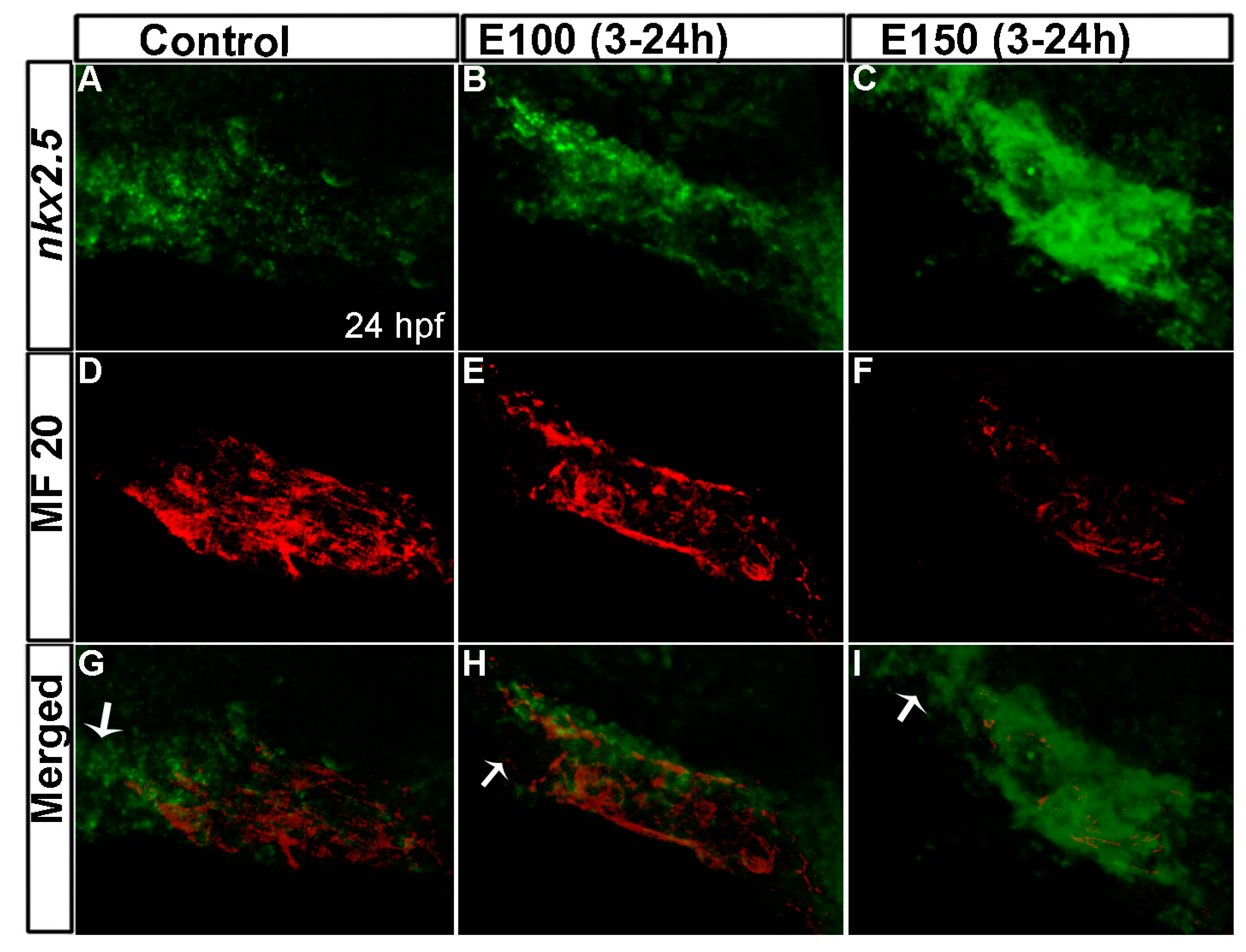 Fig. 3 Myocardial differentiation was delayed in ethanol-exposed embryos. (A–C) In situ hybridization detecting nkx2.5 expression showed weak nkx2.5 expression in the linear heart tube (indicated fewer undifferentiated FHF derived cells) but strong expression at the outflow pole (indicated arrival of second heart field (SHF) progenitors) in the control embryo (A); E100 embryos displayed strong nkx2.5 expression in the linear heart tube but no expression at the outflow pole (B); E150 embryos showed strong nkx2.5 expression in the linear heart tube and at the outflow pole (C); (D–F) Strong MF20 antibody staining in the linear heart tube in control embryos labeled differentiated cardiomyocytes (D); MF 20 staining was weaker in the heart tube in ethanol-treated embryos (E,F); (G–I) Co-labeled images showed myocardial differentiation delay in ethanol-exposed embryos. White arrows: pointing to the outflow pole.
