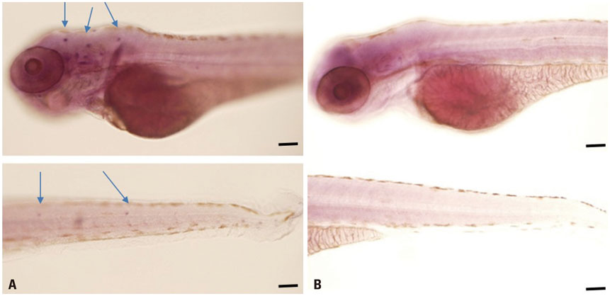 Fig. 4 In situ hybridization of miR-183 after MO injection. (A) The larvae injected with standard MO shows clear miR-183 expression in neuromast cells at 122 hours post fertilization (arrows). (B) In contrast, miR-183 expression disappeared in larvae injected with MO-183. Scale bar, 50 µm. miR, miRNA; MO, morpholino.