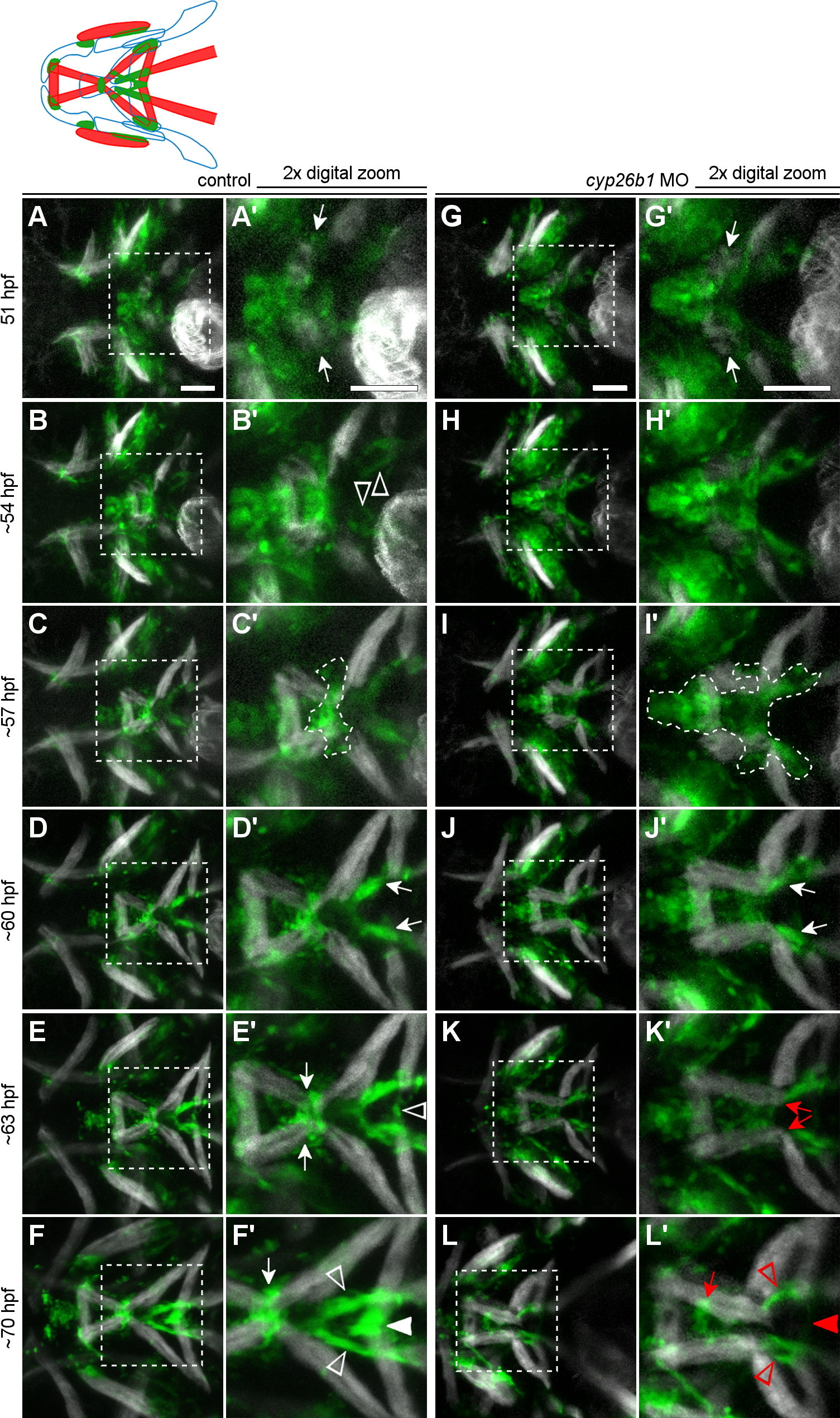 Fig. 7 Loss of Cyp26b1 function disrupts tendon morphogenesis in the second pharyngeal arch midline. (A-L) Stills from S2 Movie. (A,A’) The emerging intermandibularis muscles (arrows) are surrounded by tenoblasts at 51 hpf (B,B’). As tenoblasts converge on the midline, intermandibularis muscles point their posterior tips medially (also see S6B Fig). Meanwhile, tenoblast masses (arrowheads) associated with the hyohyal and sternohyoideus muscles on each side have become visible. (C,C’) By 57 hpf, condensing cells are visible at the mandibulohyoid junction (outline), where scxa-positive cells have segregated from the more anterior group. (D,D’) By 60 hpf, condensation of the sternohyoideus tendons is apparent (arrows). (E,E’) By 63 hpf, tenoblasts attached to each hyohyal muscle connect in the midline and a condensation forms (arrowhead). (F,F’) Approaching 3 dpf, tenoblasts at the mandibulohyoid (arrow) and hyohyal (white arrowhead) junctions are highly condensed between the muscle tips, and sternohyoideus tendons are elongated (open arrowheads). (G,G”) In morpholino-injected embryos, intermandibularis muscles (arrows) emerge normally among a field of tenoblasts around 51 hpf. (H,H’) Tenoblasts migrate slowly toward the midline, and intermandibularis posterior muscles point posteriorly at 54 hpf (also see S6D Fig). (I,I’) Tenoblasts at the mandibulohyoid junction are neither condensing nor separating from adjacent tenoblasts at 57 hpf (outline). (J,J’) Despite surrounding abnormalities, sternohyoideus tendons initiate condensation around 60 hpf (arrows). (K,K’) Connections between intermandibularis posterior muscles and sternohyoideus tendon condensations persist, and at 63 hpf the muscle tips (red arrows) now extend past mandibulohyoid tenoblasts. (L) Compared to controls, the sternohyoideus tendons are poorly condensed and elongated by 70 hpf, and both intermandibularis posterior and both hyohyal muscles connect to either end of these tendon rudiments. (L’) Mesenchymal tenoblasts sit between the intermandibularis posterior muscles (arrow) and no condensation has formed connecting the hyohyal muscles (red arrowhead). All images ventral view, anterior to the left. Scale bar = 50 μm