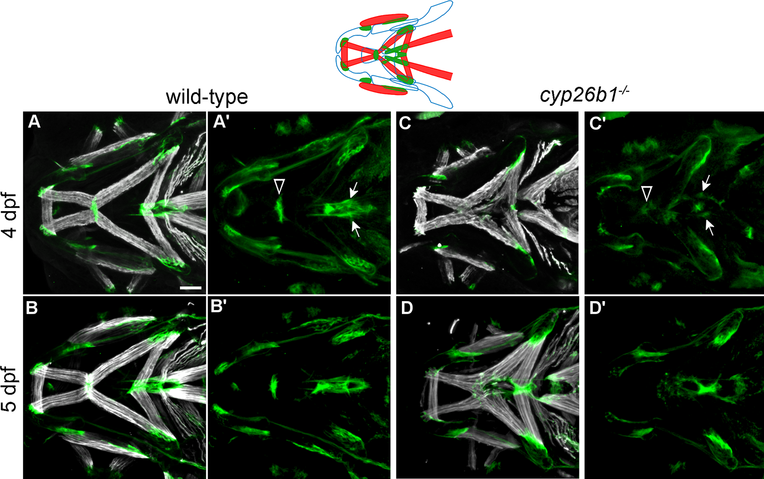 Fig. 5 Loss of Cyp26b1 function disrupts cranial tendon differentiation. (A-B) Tsp4b (green) is enriched at the muscle attachment sites in wild-type zebrafish at 4 and 5 dpf. (C) At 4 dpf, cyp26b1 mutants display Tsp4b at jaw muscle attachments, though weakly at the mandibulohyoid junction (arrowheads in A’,C’) and sternohyoideus tendons (arrows in A’,C’). (D) At 5 dpf, punctate deposits of Tsp4b can be seen at all ectopic points of jaw muscle attachment. All images ventral view, anterior to the left. Scale bar = 50 μm.