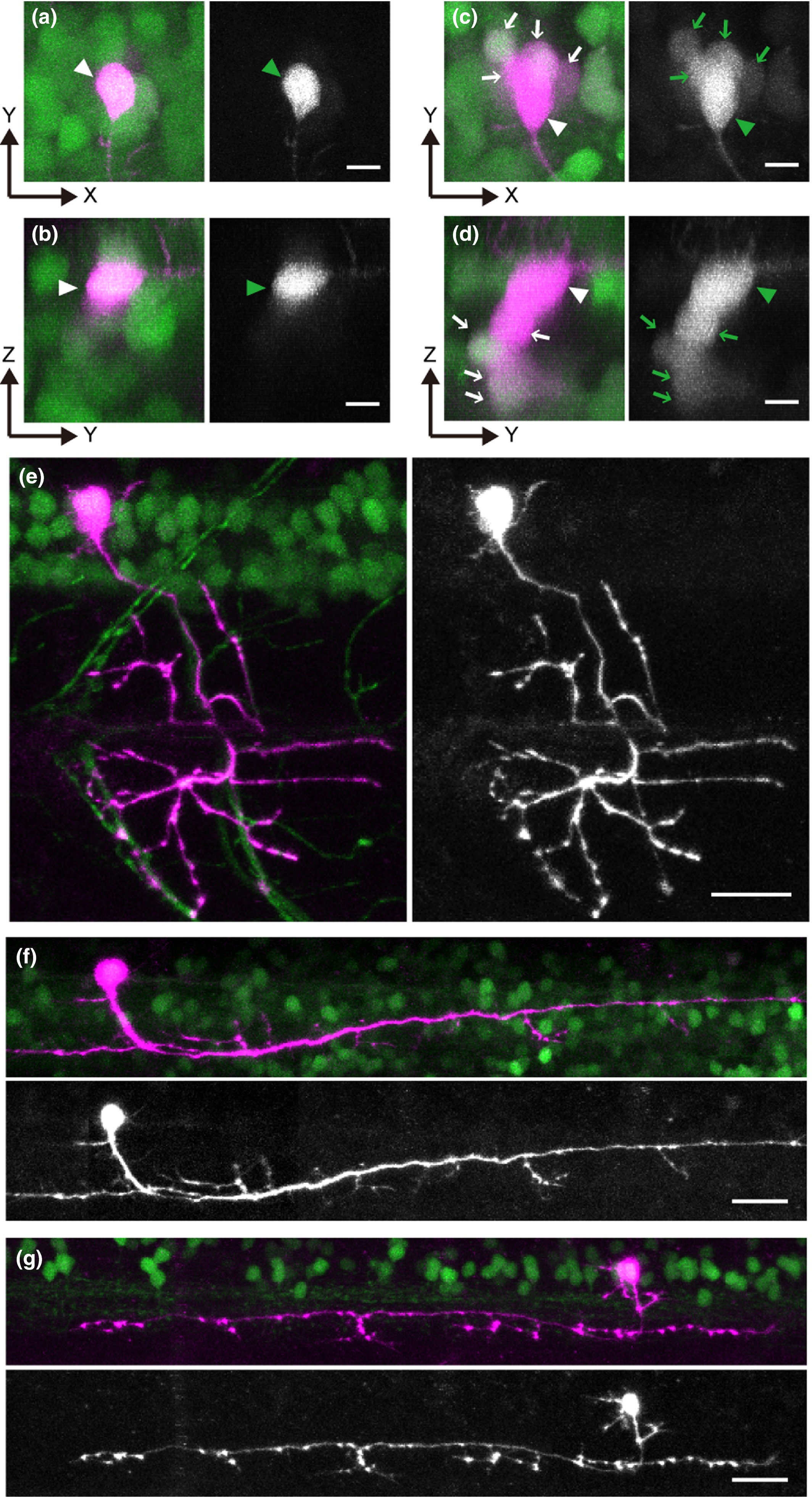 Spatially confined primed conversion enables individual neuron labeling in tightly packed neural clusters in living larval zebrafish. Photoconversion experiments were performed in the spinal cords of 3‐to‐4‐dpf larvae expressing Dendra2. (a‐d) Photoconversion of Dendra2 in Tg[HuC:Gal4]; Tg[UAS:Dendra2] with primed conversion (a and b) or conventional 405 nm illumination (c and d). (a and c) are stacked images of the X‐Y dimension, while (b and d) are stacked images of the X‐Z dimension. In each image, the left panel shows both green and red channels (red channel is shown in magenta), while the right panel shows only the red channel (shown in black‐and‐white). The primed conversion successfully highlights only the targeted cell (arrowheads in a and b). In contrast, with 405nm‐illumination, not only the targeted cell (arrowheads in c and d) but also cells located nearby (primarily those located in the Z dimension) express red Dendra2 (arrows in c and d). (e) Photoconversion of Dendra2 in Tg[vachta‐hs:Gal4]; Tg[UAS:Dendra2] with primed conversion. The morphology of an individual trunk motoneuron is clearly revealed in its entirety. (f) Photoconversion of Dendra2 in Tg[chx10:Gal4]; Tg[UAS:Dendra2] with a primed conversion. The morphology of an individual chx10‐positive neuron (a neuron whose axon descends on the same side of the spinal cord; Kimura et al., 2006) is clearly revealed. (g) Photoconversion of Dendra2 in Tg[eng1b‐hs:Gal4]; Tg[UAS:Dendra2] with primed conversion. The morphology of an individual eng1b‐positive neuron (a neuron whose axon ascends on the same side of the spinal cord; Higashijima et al., 2004a) is clearly revealed. Scale bars: 5 μm in a–d; 20 μm in e–g.