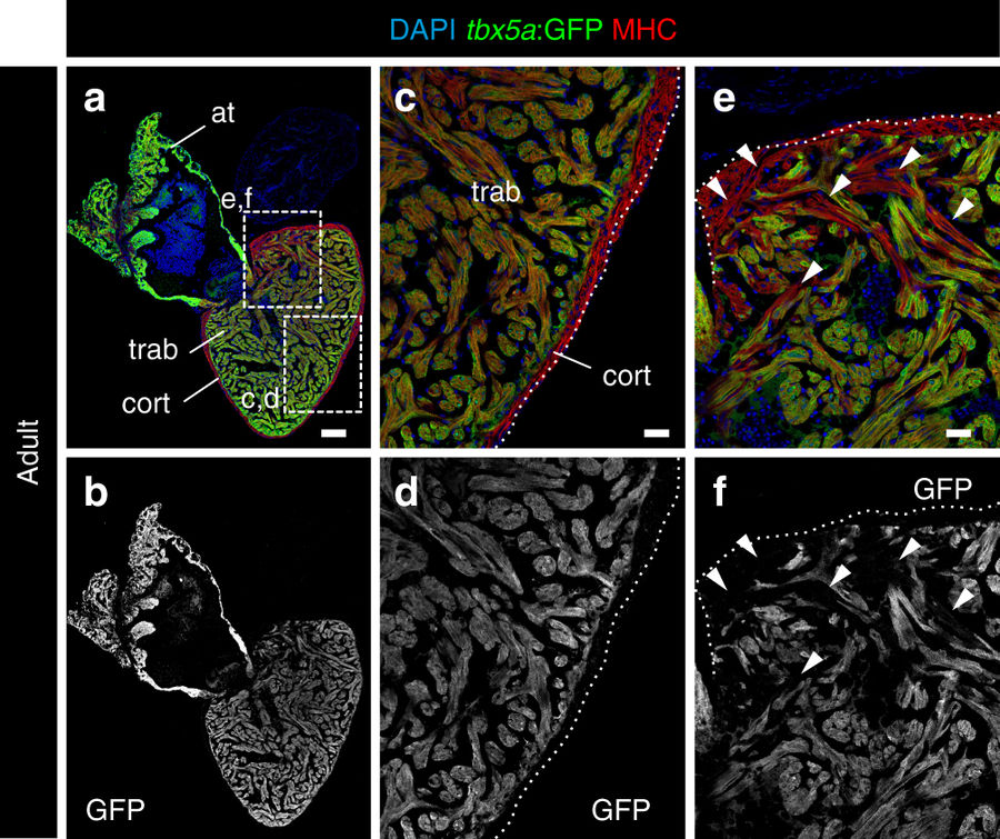 Expression profile of tbx5a-positive cardiomyocytes in adult zebrafish hearts. a, b Sagittal sections through tbx5a:GFP adult uninjured heart immunostained with GFP (green) and Myosin Heavy Chain (MHC; red). Nuclei are counterstained with DAPI (blue). c–e Zoomed views of boxed area in a. b, d, f Single channels for GFP. The trabecular myocardium is tbx5a:GFP+, whereas the cortical layer is tbx5a:GFP−. Note tbx5a:GFP− cardiomyocytes (arrowheads) in the basal part of the ventricle close to the atrioventricular canal (n = 13/13). at, atrium; cort, cortical layer; trab, trabecular layer. Scale bars, a, b 100 μm and c–f 25 μm