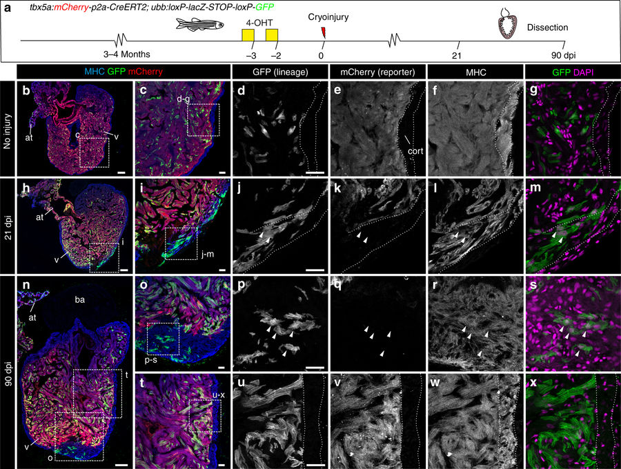 Contribution of tbx5a-derived cells during regeneration of the adult zebrafish heart. a tbx5a:Cherry-p2A-CreERT2 was crossed into ubb:loxP-lacZ-STOP-loxP-GFP. 4-Hydroxytamoxifen (4-OHT) was added 2 and 3 days before cryoinjury, to induce recombination of loxP sites. Hearts were fixed at 21 and 90 days postinjury (dpi) and sectioned for immunofluorescent detection of GFP+ tbx5a-derived cells and mCherry+ tbx5a-expressing cells. Nuclei were counterstained with DAPI. b In the uninjured heart (n = 7/7), mCherry expression was homogeneous in the trabecular myocardium and absent in the cortical layer. GFP+ cells were found in the trabecular layer. c Zoomed view of boxed area in b. d–f Single channels of boxed area shown in c. g GFP and DAPI channels only. h, n Section of hearts at 21 dpi h and 90 dpi n. Upon cryoinjury to the ventricular apex, tbx5a-derived cardiomyocytes were present also in the cortical layer, particularly at the site of injury (h–m, n = 6/7; o–s, n = 5/6; t–x, n = 6/6), whereas tbx5a+ cardiomyocytes in general were restricted to the trabecular myocardium (n = 5/6) t–x. Nuclear counterstaining revealed GFP+ cell bodies in the cortical layer (arrowheads). at, atrium; cort, cortical layer; ba, bulbus arteriosus; v, ventricle. Scale bars, b, h,n 100 µm and c, d, i, j, o, p, t, u 25 μm
