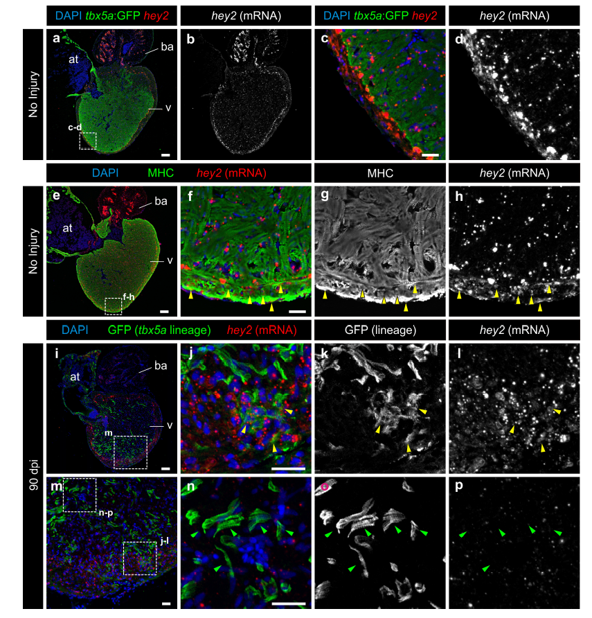 GFP immunofluorescence and hey2 RNAScope in situ detection on sagittal sections of tbx5a:GFP (a–h) or tbx5a:mCherryp-2a-CreERT2;ubb:loxP-lacZ-loxP-GFP double transgenic animals, recombined before injury and fixed at 90 days postinjury (dpi) (i–p). Nuclei are counterstained with DAPI. a–d Uninjured heart. tbx5a:GFP (green) does not co-localize with hey2 (red). Hey2 is expressed at higher and more homogenous levels in the cortical layer. e–h Uninjured heart. anti-Myosin Heavy Chain (MHC) marks cardiomyocytes (green). In the cortical layer, regions of hey2/MHC co-localisation were detected (yellow arrowheads; n=3/4). i–p 90 dpi regenerated hearts. tbx5a:mCherryp-2aCreER T2;ubb:loxP-lacZ-loxP-GFP were treated with two 12 hours pulses of 4-OHT at 6 and 7 days before the injury. GFP+ cells marking the tbx5a lineage within the cortical layer were positive for hey2 (yellow arrowheads, hey2+/GFP+ cells observed in 5 out of 6 hearts. GFP+ cells within the trabecular layer were negative for hey2 (green arrowheads; n=6/6). at, atrium; ba, bulbus arteriosus; v, ventricle. Scale bars, a, e, i 100 μm, c, f, j, n 25 μm