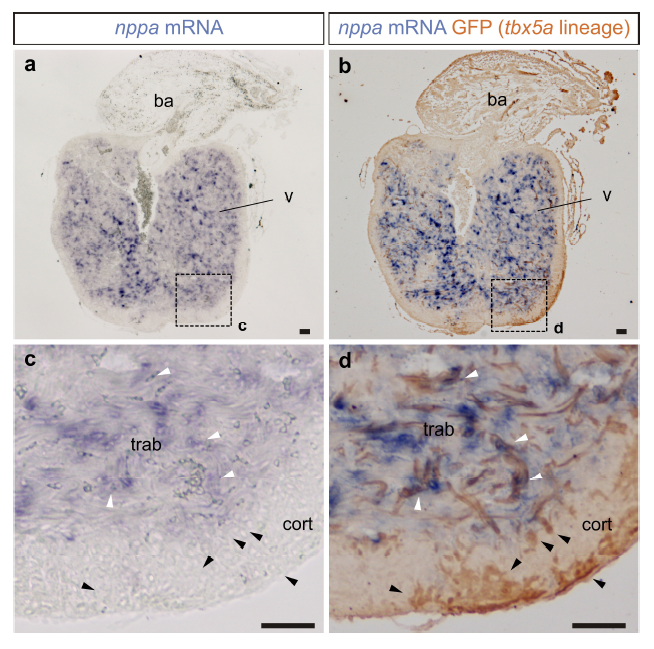 nppa mRNA in situ hybridisation (a) on sagittal sections of tbx5a:mCherryp-2a-CreERT2;ubb:loxP-lacZ-loxP-GFP double transgenic animals, recombined before injury and fixed at 90 days postinjury (dpi) followed by GFP immunofluorescence (b) nppa is expressed in the trabecular layer (white arrowheads). In the cortical region, tbx5a-derived GFP+ cells are visible, which are not positive for the trabecular marker nppa (black arrowheads, n=7/7). c and d are a zoomed with of boxed areas in a and b. ba, bulbus arteriosus; cort, cortical layer; trab, trabecular layer; v, ventricle. Scale bars, 50 μm