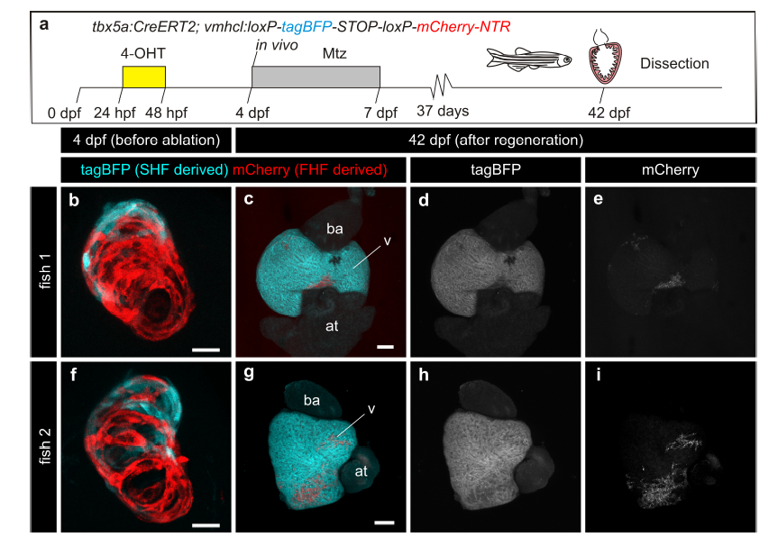 a tbx5a+ ventricular cardiomyocytes were genetically ablated in tbx5a:CreERT2;vmhcl:loxP-tagBFP-loxP-mCherry-NTR double transgenic zebrafish. Recombination was induced by administration of 4- Hydroxytamoxifen (4-OHT). Fish were individualised, imaged at 4 days postfertilisation (dpf) and cell ablation was induced by administration of Metronidazole (Mtz) from 4 to 7 dpf. b,f Maximum projection of confocal z-stacks of 4 dpf embryos. c–e, g–i Hearts dissected from the same fish at 42 dpf. at, atrium; ba, bulbus arteriosus; v, ventricle. Scale bars, b, f 25 μm, c, g 100 μm