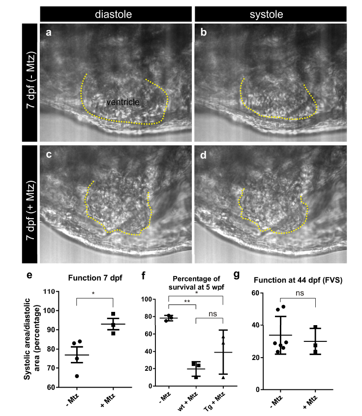 tbx5a+ ventricular cardiomyocytes were genetically ablated in tbx5a:CreERT2;vmhcl:loxPtagBFP- loxP-mCherry-NTR double transgenic zebrafish. Recombination was induced by administration of 4-Hydroxytamoxifen (4-OHT) at 1 and 2 days postfertilisation. Animals were divided into two groups. Cell ablation was induced in one group by administration of Metronidazole (Mtz) from 4 to 7 dpf. Videos were acquired at 7 dpf, immediately after the last Mtz treatment. a–d are still images from the videos from two Mtz-treated (from a total of 4) and two non-treated (from a total of 3) animals. Shown are lateral views of the heart, the head is to the left. The ventricle is outlined in yellow. Note the irregular shape and overall smaller area in Mtz-treated hearts. e The maximum (diastolic) and minimum (systolic) ventricular area was measured to determine ventricular function. P= 0.0348 by a two-tailed t-test. Deficient contraction was detected upon Mtz treatment. f Percentage of survival at 5 weeks post fertilization (wpf); mean±s.d **P<0.01; *P<0.05; ns, nonsignificant by one-way ANOVA followed by Tukey’s multiple comparisons test. Each point represents the survival percentage of a group comprising 14-22 fish each. –Mtz: same stages control fish; sib+Mtz= tbx5a:CreERT2 and vmhcl:loxP-tagBFP-loxPmCherry- NTR single transgenic siblings; Tg+Mtz= tbx5a:CreERT2;vmhcl:loxP-tagBFPloxP- mCherry-NTR double transgenic fish. g Assessment of ventricular Fractional Volume Shortening (FVS) by echocardiography at 44 dpf. Shown are individual measurements as well as mean±s.d; ns, P = 0.6262 by two-tailed unpaired t-test; n=7 for – Mtz group and n=3 for + Mtz group