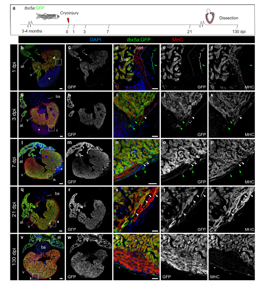 a, Illustration of the experimental setup. b–z Sagittal sections through tbx5a:GFP hearts at 1 (b–f n=4/4), 3 (g–k n=4/5), 7 (l–p n=3/3), 21 (q–u n=4/4) and 130 (v–z n=4/4) days post injury (dpi). Sections were immunostained with anti-GFP (green) and anti-Myosin Heavy Chain (MHC; red). Nuclei are counterstained with DAPI (blue). Asterisks indicates the injury area, dotted line marks the outer border of the cortical layer. tbx5a:GFP expression is limited to the trabecular myocardium. Few myosin-negative tbx5a:GFP+ cells are found within the epicardial layer (arrowhead). At 130 dpi, a tbx5a:GFP- thickened cortical myocardium covers a tbx5a:GFP+ trabecular myocardium at the injury site (v–z). White arrowheads point to tbx5a:GFP+ cardiomyocytes; green arrowheads label tbx5a:GFP+ noncardiomyocytes. Scale bars, b, g, l, q, v 100 μm, d, i, n, s, x 25 μm