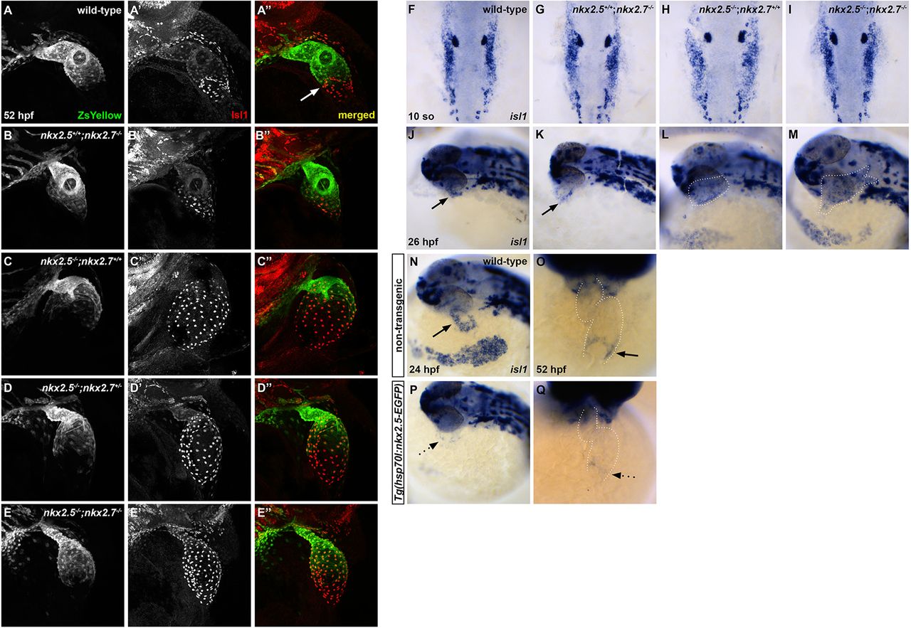 Nkx2.5 is not required for isl1+ progenitor specification, but is sufficient to repress isl1 at the venous pole. (A-E″) Representative confocal images, lateral view, anterior towards the top, at 52 hpf. Immunostaining for Isl1 (red) in embryos carrying Tg(nkx2.5:ZsYellow) demonstrates that Isl1 is restricted to the venous pole and Nkx2.5 expression is absent in this region in wild-type (white arrow) (A-A″) and nkx2.5+/+;nkx2.7−/− (B-B″) embryos. However, Isl1 expression is derepressed in the atrium of nkx2.5−/−;nkx2.7+/+ (C-C″) and nkx2.5−/−;nkx2.7+/− (D-D″) embryos, and expands towards the outflow tract in nkx2.5−/−;nkx2.7−/− (E-E″) embryos. (F-I) Dorsal view, anterior towards the top, at 10 somites. In situ hybridization shows no variation in ALPM isl1 expression between wild-type (F) and nkx mutant (G-I) embryos. (J-M) Lateral view, anterior towards the left, at 26 hpf. In situ hybridization demonstrates that isl1 expression is restricted to a ring at the venous pole of the heart tube in wild-type (J) and nkx2.5+/+;nkx2.7−/− (K) embryos. However, isl1 expression expands to the atrium in nkx2.5−/−;nkx2.7+/+ embryos (L) and throughout the entire heart tube in nkx2.5−/−;nkx2.7−/− embryos (M). Black arrows indicate the ring of isl1 expression near the IFT (J,K). (N-Q) Lateral view, anterior towards the left, at 24 hpf (N,P) and ventral view, anterior towards the top, at 52 hpf (O,Q) in non-transgenic (N,O) and Tg(hsp70l:nkx2.5-EGFP) (P,Q) embryos. In situ hybridization demonstrates that isl1 expression is restricted to a ring at the venous pole (black arrows) at 24 hpf (n=9) (N) and 52 hpf (n=7) (O), and that overexpression of nkx2.5 inhibits isl1 expression specifically in this region (dotted arrows) at 24 hpf (n=9/11) (P) and 52 hpf (n=8/9) (Q).