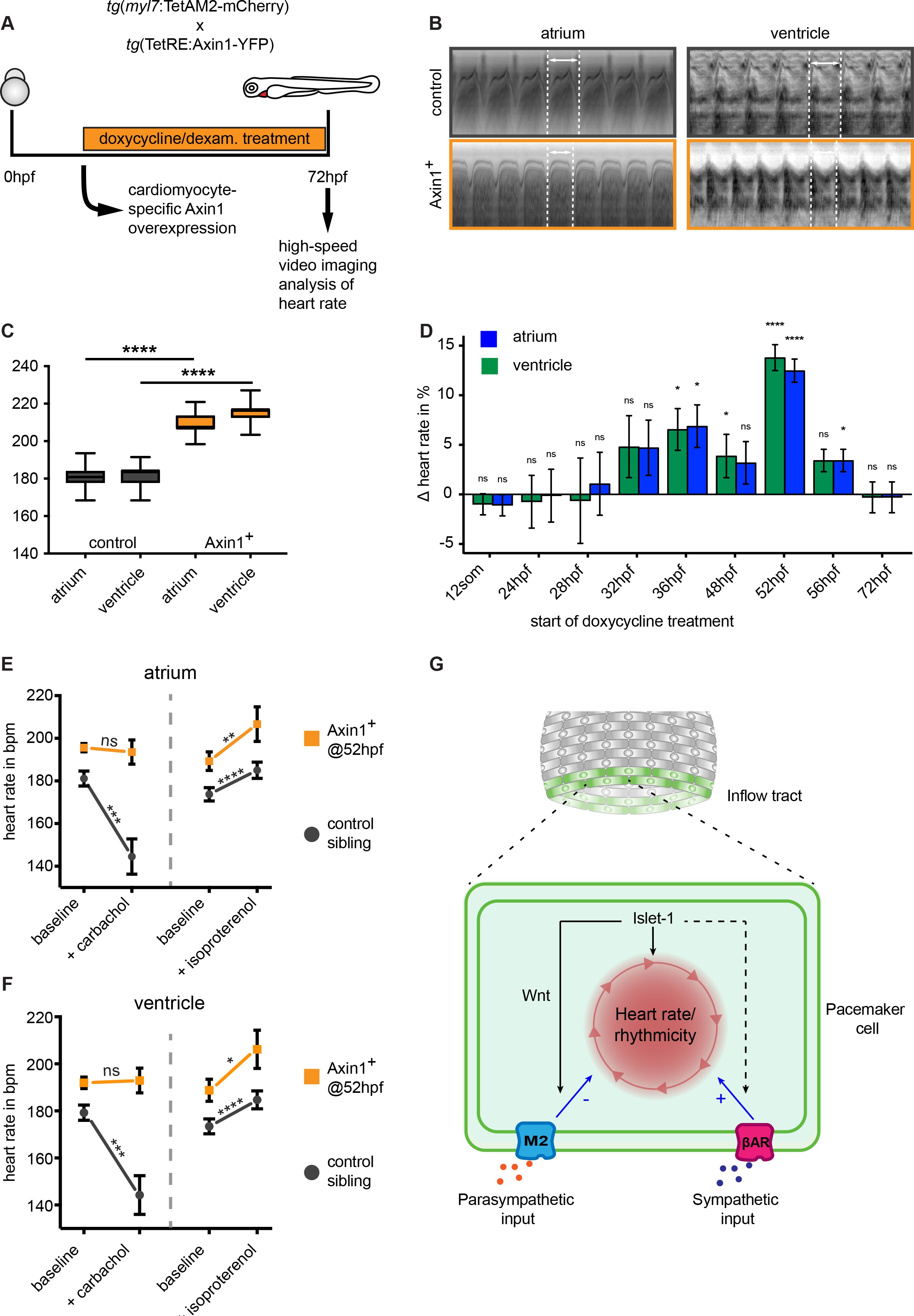 (A) Experimental timeline. Embryos with the ubiquitous tg(TETRE:Mmu.Axin1-YFP)tud1 and cardiomyocyte-specific tg(myl7:TETAM2-2A-mCherry)ulm8 transgenes were incubated with doxycycline (25 μg/mL) plus dexamethasone (100 μM) to induce cardiomyocyte specific Axin1-YFP expression. Axin1-YFP was induced at different time points and the heart rate was measured at 3 dpf by high-speed video imaging and image analysis. (B) Atrial and corresponding ventricular kymographs from a representative mCherry-/YFP- sibling control and an embryo with Axin1-YFP overexpression (Axin1+). Note the shorter period per full heartbeat (indicated by white dotted lines) in the Axin1 expressing embryo. Movies are available as Figure 6—videos 1 and 2, respectively. (C) Result of heart rate analysis (ventricle and atrium) on sibling and Axin1+ embryos, showing a significant increase in heart rate in Axin1+ embryos. (D) Relative changes in heart rate measured at 3 dpf after induction of Axin1 expression at various time points. ∆heart rate was calculated by using the heart rates measured in the Axin1+ group and the control group using the following formula: (Axin1-YFP+ - mCherry-/YFP-) / (mCherry-/YFP-) x 100%. Induction of Axin1-YFP expression between 32 hpf and 56 hpf resulted in increased heart rates at 3 dpf. See also Figure 6—videos 1 and 2. n(control/Axin1+) 9/6 (12som); 20/15 (24hpf); 10/7 (28hpf); 18/16 (32hpf); 10/8 (36hpf); 30/21 (48hpf); 37/28 (52hpf); 27/23 (56hpf); 30/29 (72hpf). Column bar graph plotting mean with SEM. Atrial (green) and ventricular (blue) analysis (E–F) Heart rates at 3 dpf of control (mCherry-/YFP-) or Axin1-YFP+ embryos at baseline or after treatment with the parasympathetic agonist carbachol or the sympathetic agonist isoproterenol. Atrial (E) and ventricular (F) measurements. (left n = 27 (control), 26 (Axin+); right n = 20 (control), 14 (Axin+)) (G) Proposed model for Isl1/Wnt function in cardiac pacemaker cells. Isl1 is a central factor in pacemaker cell development. Isl1 expression is restricted to pacemaker cells in which it is required to establish the rhythmic cycle of membrane depolarizations and heart contractions and the activation of Wnt/β-catenin signaling. Wnt/β-catenin signaling is required to establish M2 cholinergic receptor signaling, which allows parasympathetic signals (e.g. acetylcholine) to adjust the rate of rhythmic membrane depolarizations and heart contractions. βAR, β-Adrenergic Receptor. Statistical significance (unpaired (D) and paired (E–F) t-test) *p<0.05; **p<0.01; ***p<0.001; ****p<0.0001. See also Figure 6—source data 1, Figure 6—figure supplement 1, Figure 6—figure supplement 2, Figure 6—figure supplement 3, Figure 6—video 1 and Figure 6—video 2.