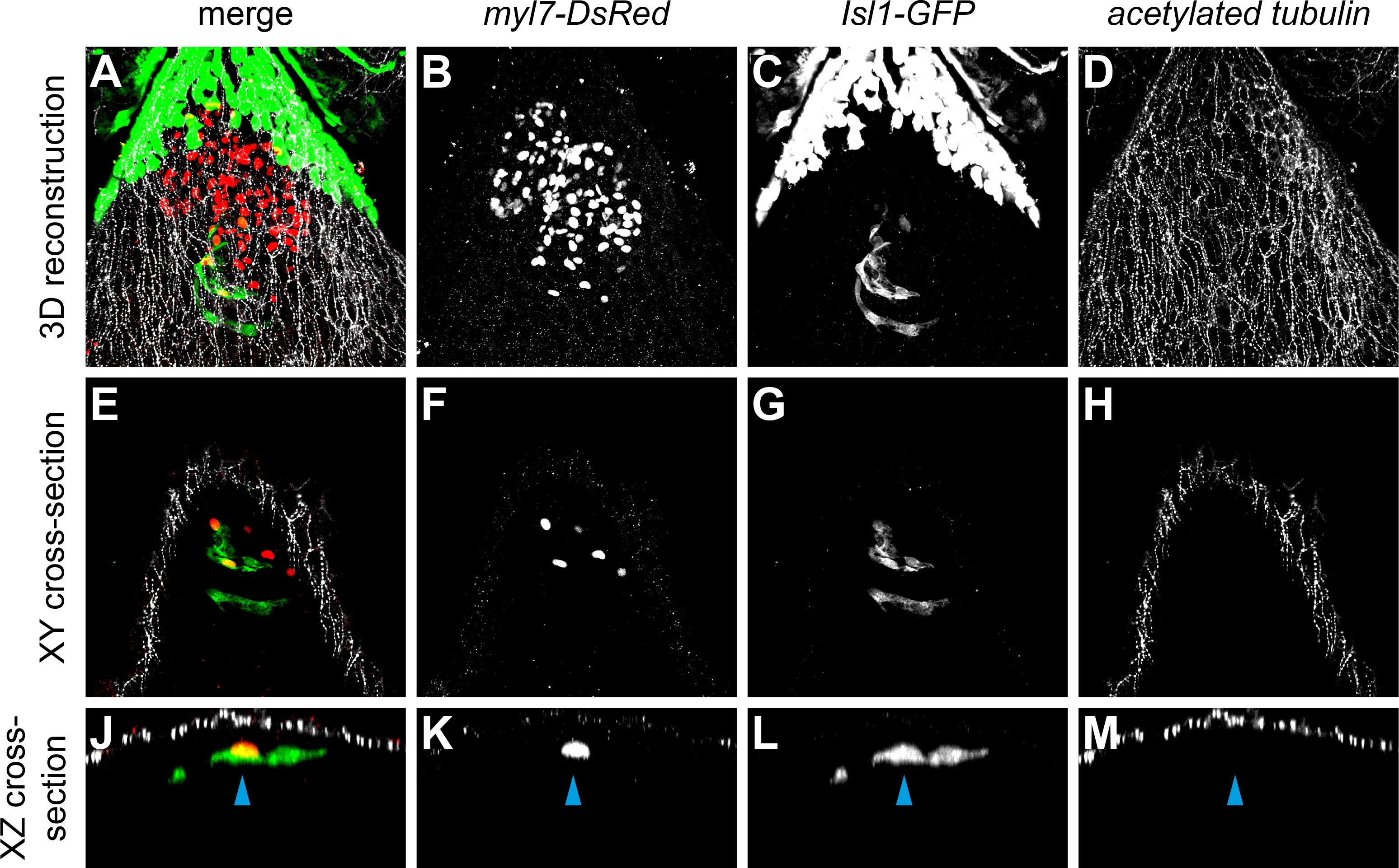Confocal scans from whole mount embryos containing the tg(myl7-DsRed) (marking all cardiomyocytes) and the tg(Isl1:GFF;UAS:GFP) (reporting isl1 expression and marking pacemaker cells in green) and stained for acetylated tubulin (marking acetylated microtubules found in neurons and axons). Anterior is up and posterior is down. 3D reconstruction (A–D) and cross-sections (E–M). The skin immediately ventral to the heart is covered in axons. The Isl1-GFP-positive pacemaker cells (arrowhead) at the sinoatrial junction are not in direct contact with the acTubulin+ axons.