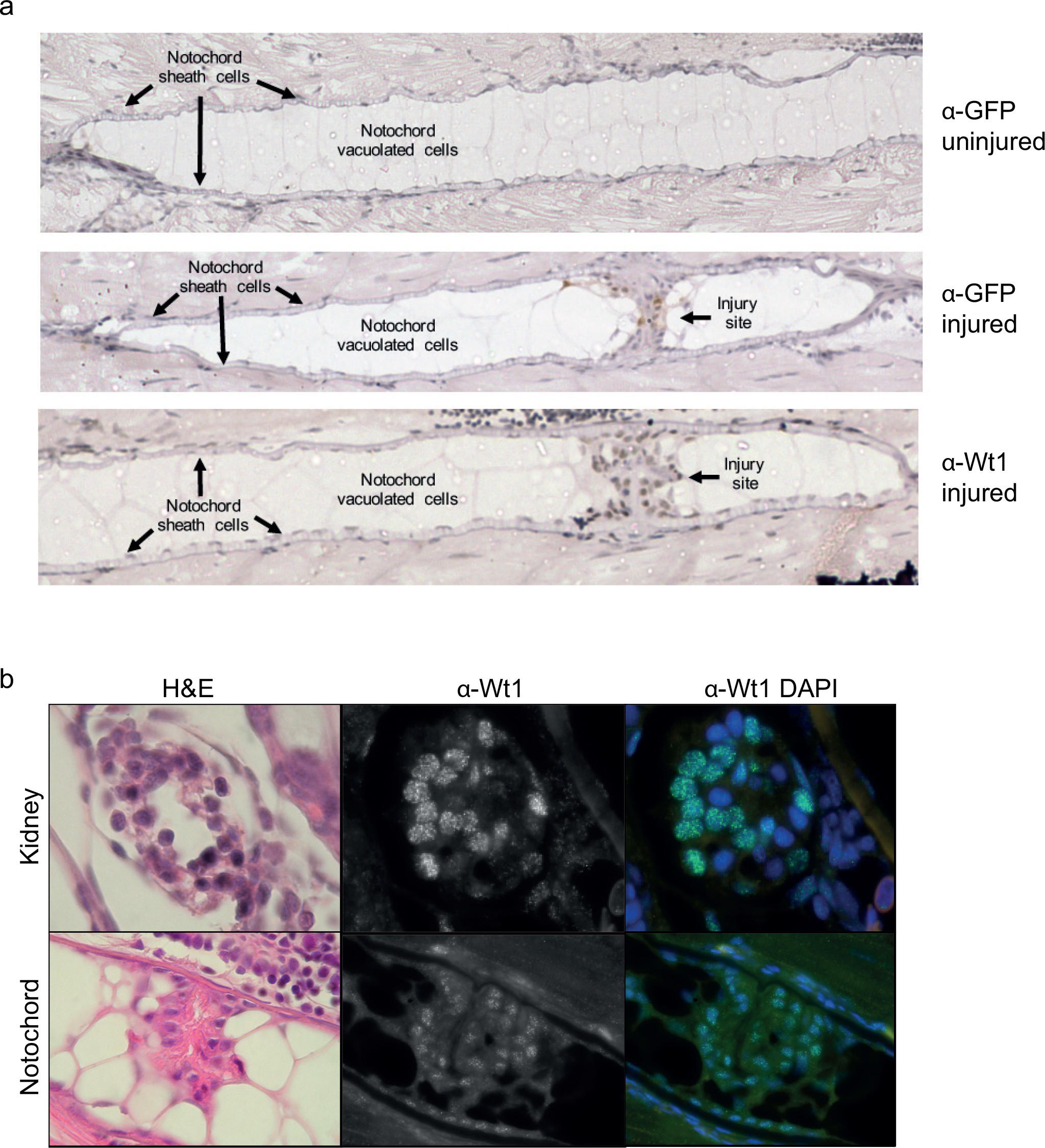 (a) Immunohistochemistry of injured and uninjured notochord regions, stained with α-GFP and α-Wt1 antibodies. Sheath cells and vacuolated cell populations, and injury site are indicated. n > 10; five experimental replicates. (b) Immunofluorescence of 3 dpi injured notochord tissue stained with α-Wt1 antibody. Kidney tissue is shown as a positive control. dpi: days post injury. Experimental replicates = 5; n = 5.