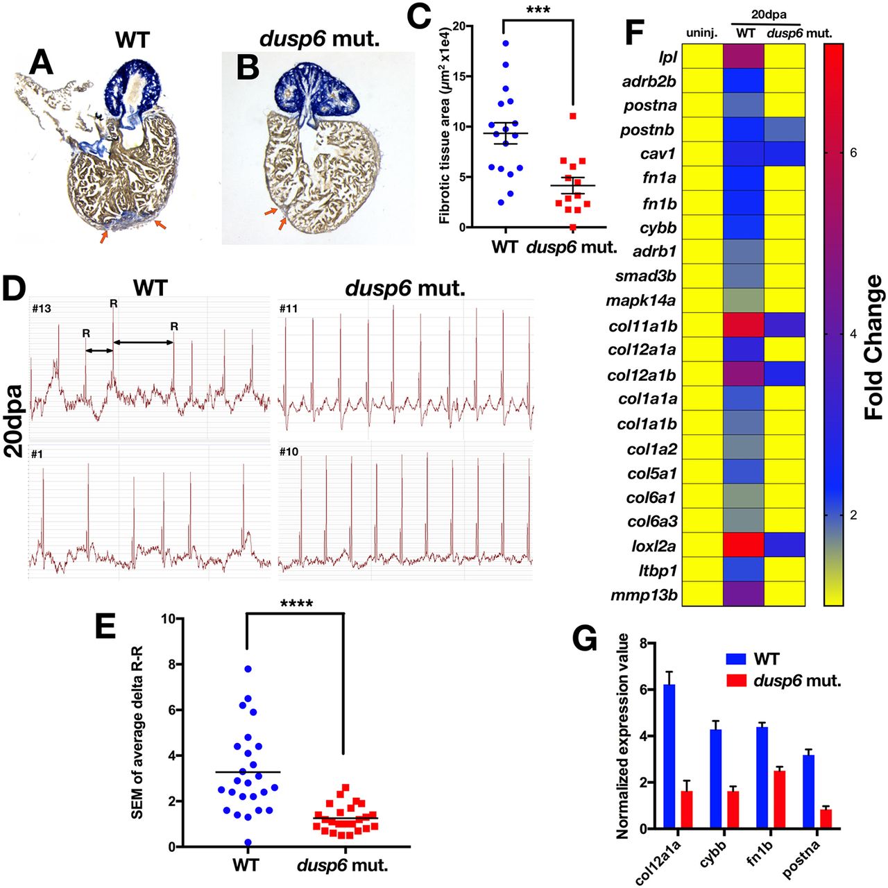 dusp6 mutant hearts show accelerated regeneration. (A,B) Sections of hearts at 20 dpa stained with AFOG to visualize the deposition of fibrotic tissue (arrows). dusp6 mutant hearts (n=13) (B) have reduced fibrotic tissue area compared with WT hearts (n=17) (A). (C) Quantitation of fibrotic tissue area at 20 dpa. ***P<0.001, Student's t-test. (D) Representative ECG from WT (n=25) and dusp6 mutants (n=24) at 20 dpa. dusp6 mutant fish exhibit fewer arrhythmic events than WT. ECG are shown from four fish (#1, #10, #11, #13). (E) Quantitation of the arrhythmic events, measured as R-R intervals, in WT and dusp6pt30a/pt30a zebrafish at 20 dpa. ****P<0.0001, Student's t-test. (F) RNA-seq analysis of uninjured hearts and hearts at 20 dpa. At 20 dpa, WT hearts express fibrosis genes, but in dusp6pt30a hearts fibrosis genes are downregulated, suggesting faster regeneration. (G) Q-PCR analysis of selected fibrosis genes in hearts at 20 dpa. dusp6pt30a hearts show downregulation of fibrosis genes. Values are normalized to β-actin and rnap expression. Data are from one representative experiment from three independent biological replicates.