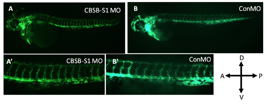 Lack of vascular phenotype in cbsb (~50 hpf) morphants. The Tg (flk:EGFP) fish used in the figure 5 experiment carried a VEGFR2 promoter (FLK) driving enhanced green fluorescent protein (EGFP) in the vasculature. A and A’ are cbsb splice MO1 (CBSB-S1) MOinjected fish while B and B’ are control (Con) MO-injected fish. A’ and B’ are high magnification images of the trunk vasculature. In the figure panels, the embryo orientation is left is anterior (A) and right is posterior (P) while top is dorsal (D) and bottom is ventral (V).