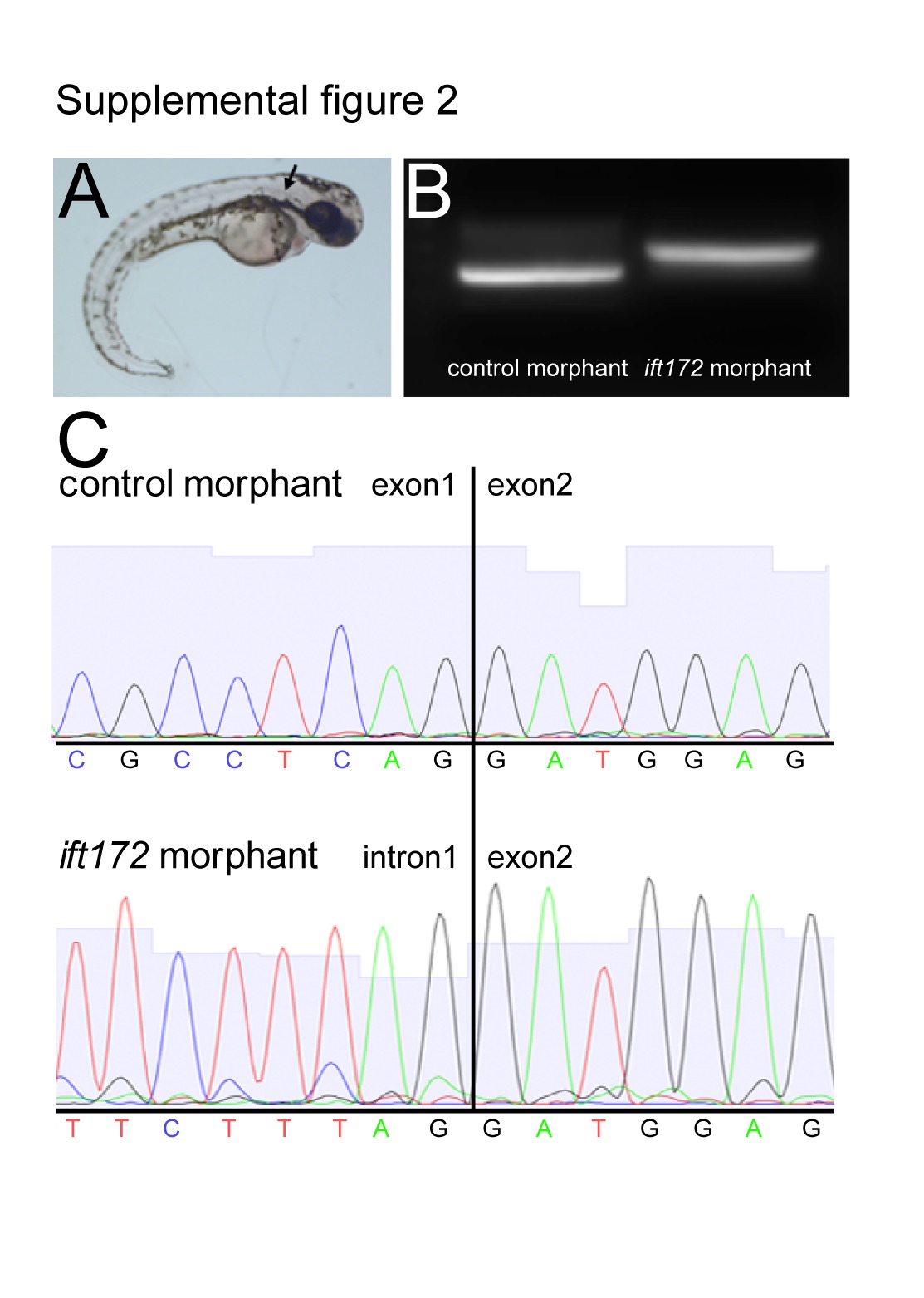 (A) Phenotype of ift172 MO fish, arrow points at kidney cyst. (B) Larger ift172 PCR product using ift172 cDNA as a template in ift172 morphant. (C) Sequence analysis reveals that injection of ift172 MO leads to retention of intron 1 in cDNA of morphants, leading to a predicted 16 amino acids peptide instead of the 1745 amino acids of the original protein.
