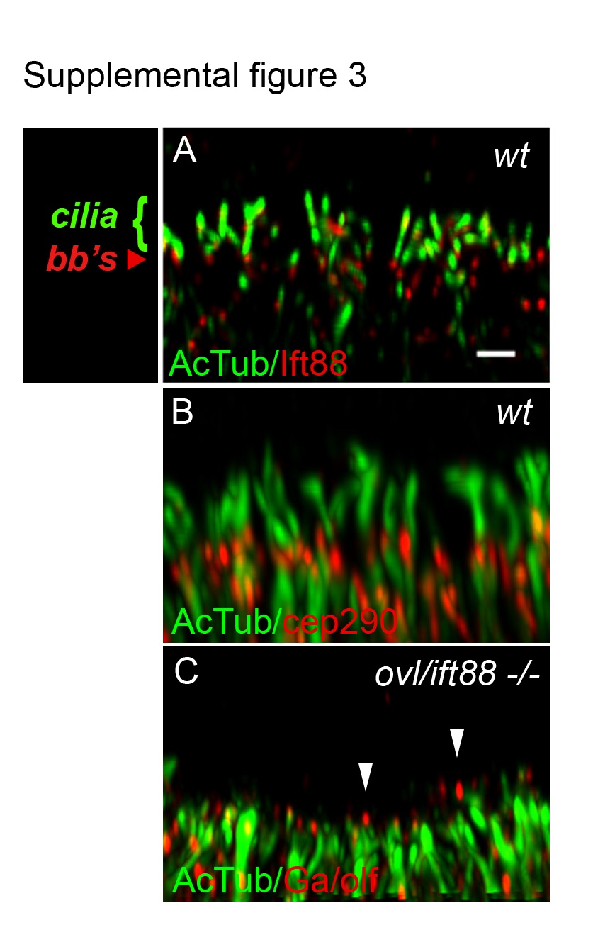Fig. S3 Olfactory sensory cilia deficit in oval/ift88 -/- mutants. (A) Olfactory sensory cilia in the center of a wild type olfactory placode stained with anti-Ift88 (red) and anti-acetylated tubulin (green; cilia) and imaged in confocal Z-stacks. Ift88 immunoreactivity was strongest in basal bodies (bb's). Scale bar in (A) equals 1 µm. (B) Wild type olfactory placode stained with anti-acetylated tubulin (green; cilia and neuronal cell body processes) and anti-cep290 (red; basal bodies). (C) oval mutant olfactory placode stained with anti-G /olf (red) and anti-acetylated tubulin (green) shows cilia loss with some short, residual G /olf-positive axonemes (arrowheads). All panels are set at equivalent scale and represent a 3µm thick maximum intensity projection of the center of the olfactory placode.