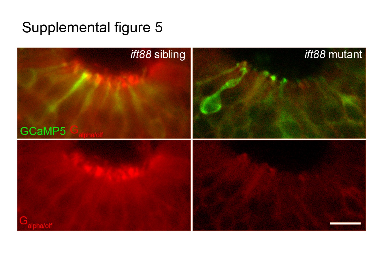 (A) Whole mount in situ hybridization using the omp probe showing omp expression in olfactory epithelia both in ift88 mutants and wildtype siblings at 2, 3, 4, and 5 dpf. (B) Tg(omp:mCherry) fish demonstrate presence of Omp-positive OSNs in ift88 wildtype siblings (B) and ift88 mutants (B') at 5 dpf. (C) Anti-GFP (green) and anti-G /olf (red) staining shows presence of ciliated OSNs in the ift88 wildtype sibling, in the ift88 mutant omp-positive cells are detected based on their characteristic flask like shape (arrows) in Tg(elavl3:GCaMP5) fish at 6 dpf. Scale bar is 50 µm in B, and 10 µm in C.