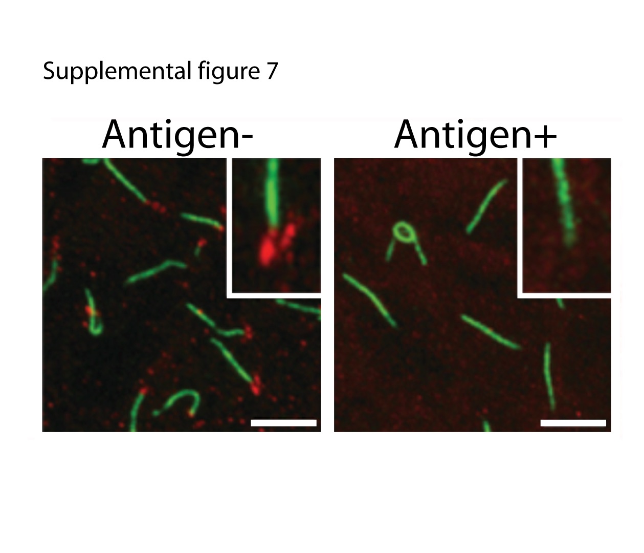 Fig. S7 Anti-Cep290 antibody validation. In a 10 somite stage zebrafish embryo, the Cep290CT antibody (red) stain punctate structures at the base of Kuppfer's vesicle cilia (anti-acetylated tubulin in green). Staining is lost when the antibodies are preincubated with antigen, demonstrating antibody specificity. Inset: magnified view of a single basal body region. Scale bar is 5 µm.
