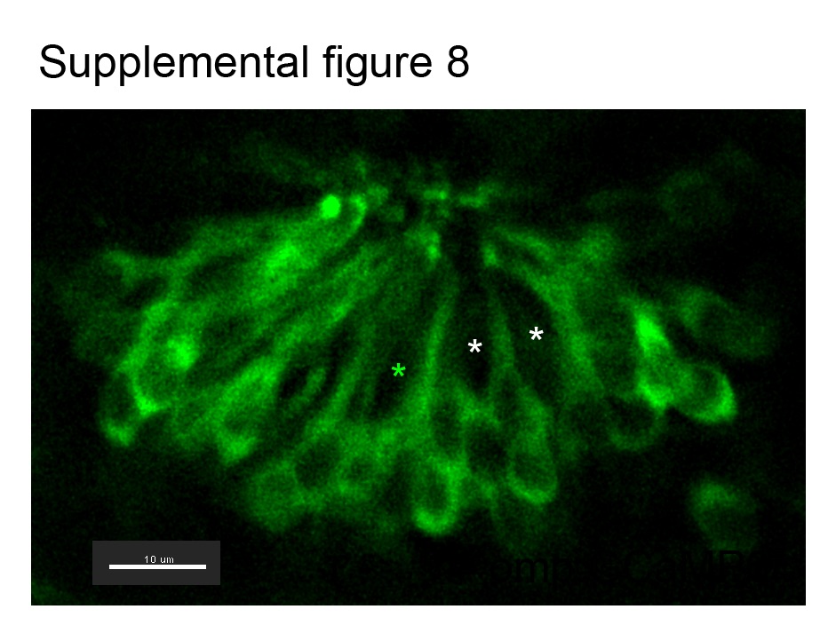 GCaMP6f expression in the olfactory placode in 2.5 dpf Tg(omp:GCaMP6) larvae. GCaMP6f in Tg(omp:GCaMP6) larvae was selectively expressed in flask shaped OSNs, representing a subset of ciliated OSNs adjacent to non-expressing (asterisk), presumably microvillus OSNs (see figure 1).