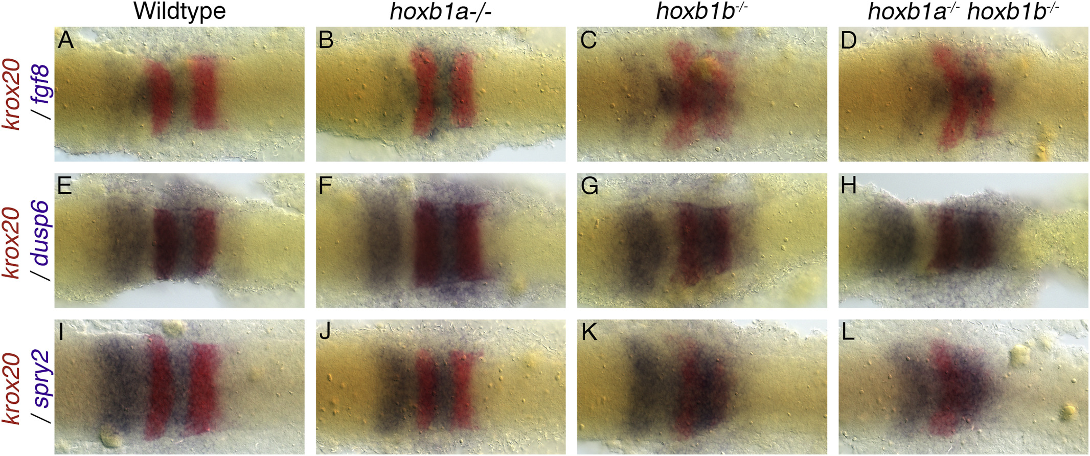 The expression of representative markers is examined in combination with krox20. Fgf8, dusp6 and spry2 are shown in purple, while krox20 is shown in red. Krox20 expression labels r3 and r5. All embryos are dorsal views, anterior to the left, 4–5 somites. Fgf8 is expressed in r4, medial r2 and the MHB (A). The loss of hoxb1a reduces the space between r2 and r4 and the MHB becomes arrowhead shaped (B). In hoxb1b−/− mutants (C) and hoxb1a−/−hoxb1b−/− mutants (D) there is ectopic expression of fgf8 in r3 and reduced expression in the lateral portions of r4. The expression of FGF responsive genes, dusp6 (E-H), and spry2 (I-L), are unaltered from wildtype (E,I) in hoxb1a−/− mutants (F,J). In both hoxb1b−/− mutants (G,K) and hoxb1a−/−;hoxb1b−/− mutants (H,L) there is an increase in expression levels. Spry2 shows ectopic expression in r3 (K,L). All embryos have been genotyped for hoxb1asa1191 and hoxb1bua1006. All images are dorsal views, anterior to the left, 4 somites.