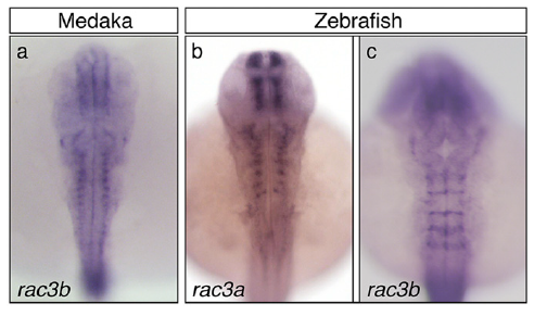 Comparison of the hindbrain expression profiles of rac3a and rac3b paralog genes from medaka and zebrafish. In situ hybridization of medaka (A; stage 24) and zebrafish (B; 40 hpf; C; 24 hpf) embryos for rac3a (B) and rac3b (A and C) genes. Note that rac3b in medaka is not expressed in hindbrain boundaries, and its expression is similar to rac3a in zebrafish. All images are dorsal views with anterior at the top.