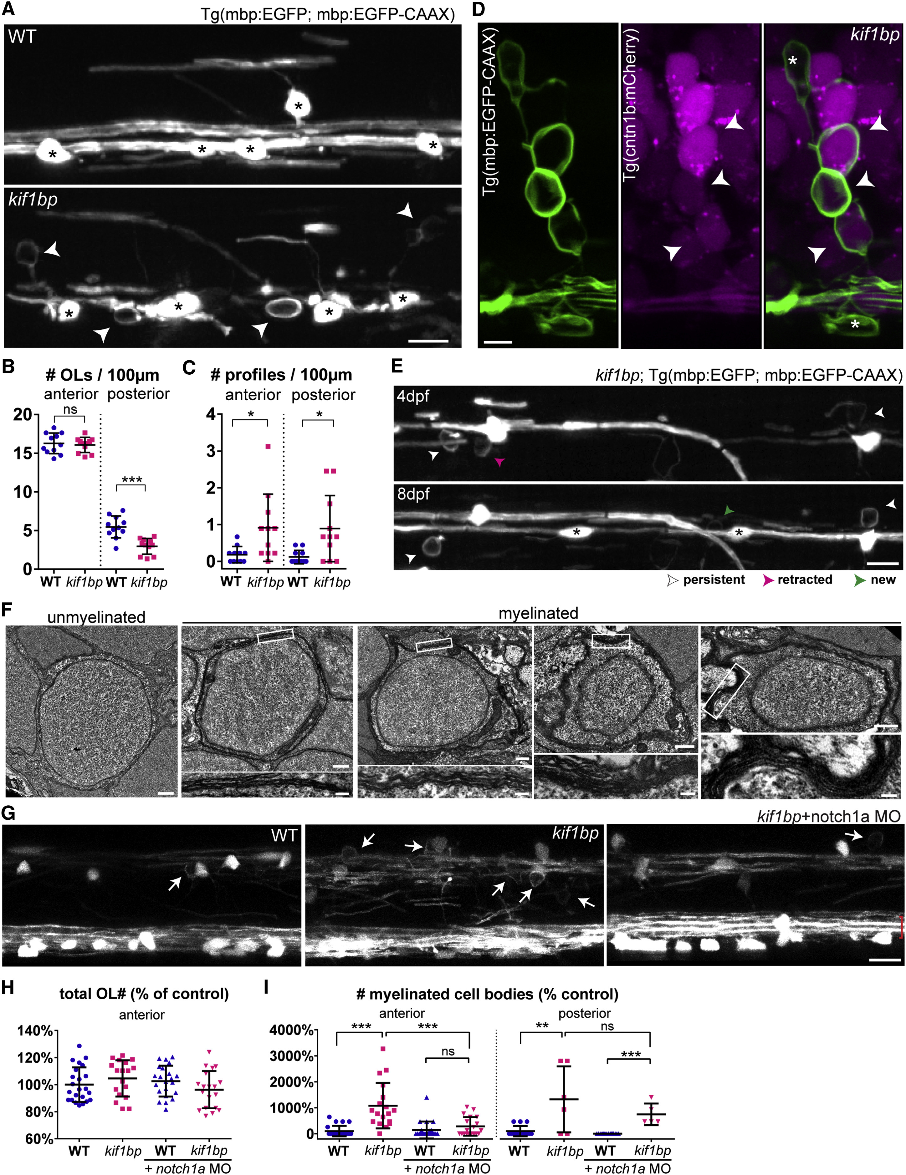 (E) Time course of double oligodendrocyte and myelin reporter in kif1bp mutant. Asterisks denote new oligodendrocytes.