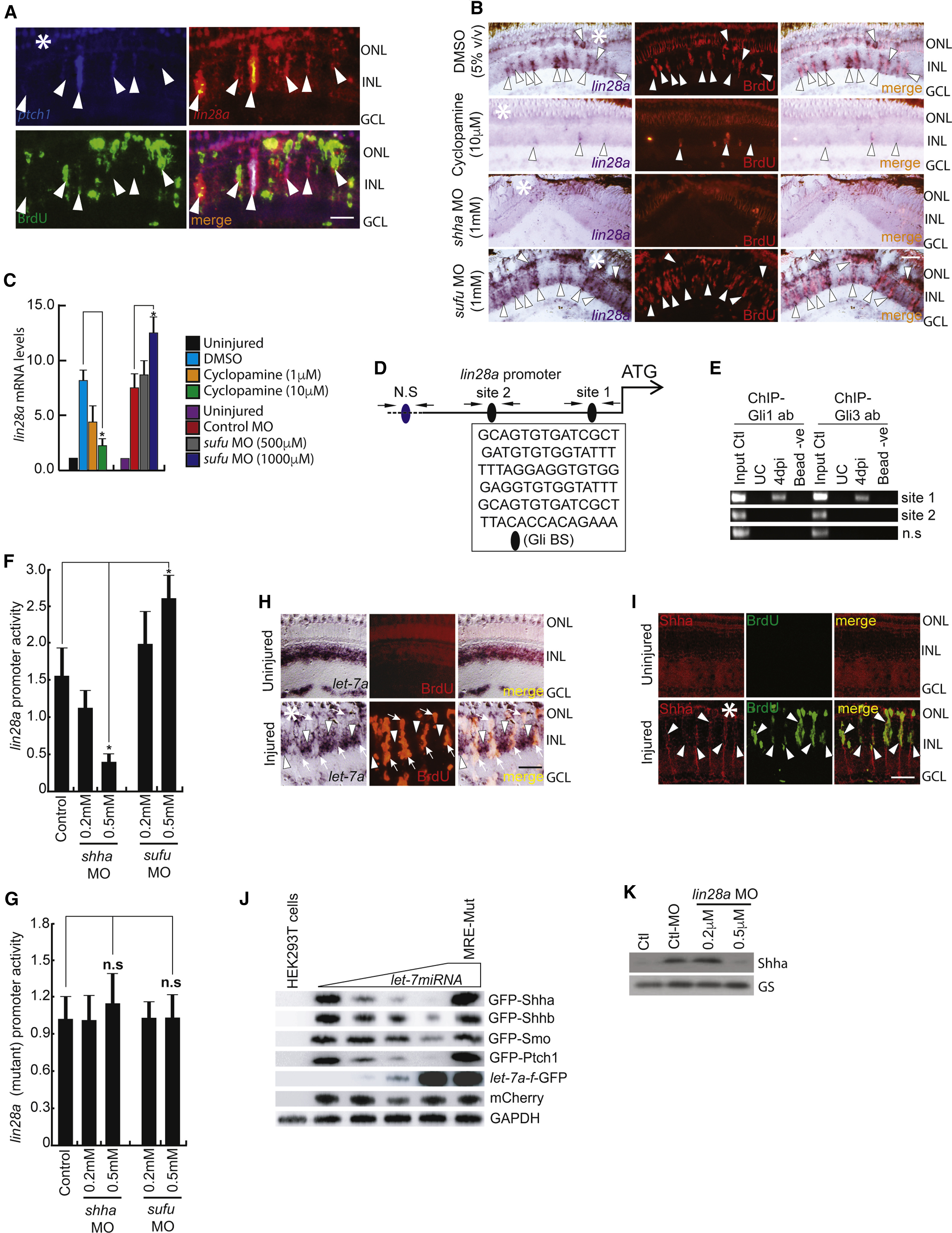 (K) Western blot of Shha in lin28a-MO electroporated retina at 4 dpi.